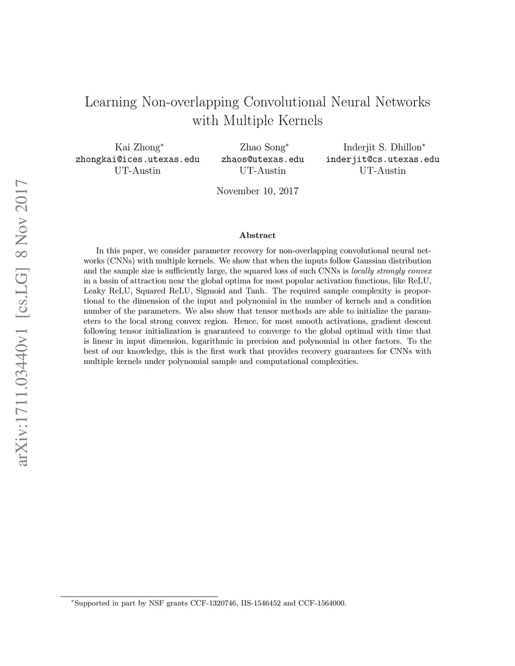 In this paper, we consider parameter recovery for non-overlapping convolutional neural networks (CNNs) with multiple kernels. We show that when the inputs follow Gaussian distribution and the sample size is sufficiently large, the squared loss of such CNNs is in a basin of attraction near the global optima for most popular activation functions, like ReLU, Leaky ReLU, Squared ReLU, Sigmoid and Tanh. The required sample complexity is proportional to the dimension of the input and polynomial in the number of kernels and a condition number of the parameters. We also show that tensor methods are able to initialize the parameters to the local strong convex region. Hence, for most smooth activations, gradient descent following tensor initialization is guaranteed to converge to the global optimal with time that is linear in input dimension, logarithmic in precision and polynomial in other factors. To the best of our knowledge, this is the first work that provides recovery guarantees for CNNs with multiple kernels under polynomial sample and computational complexities.