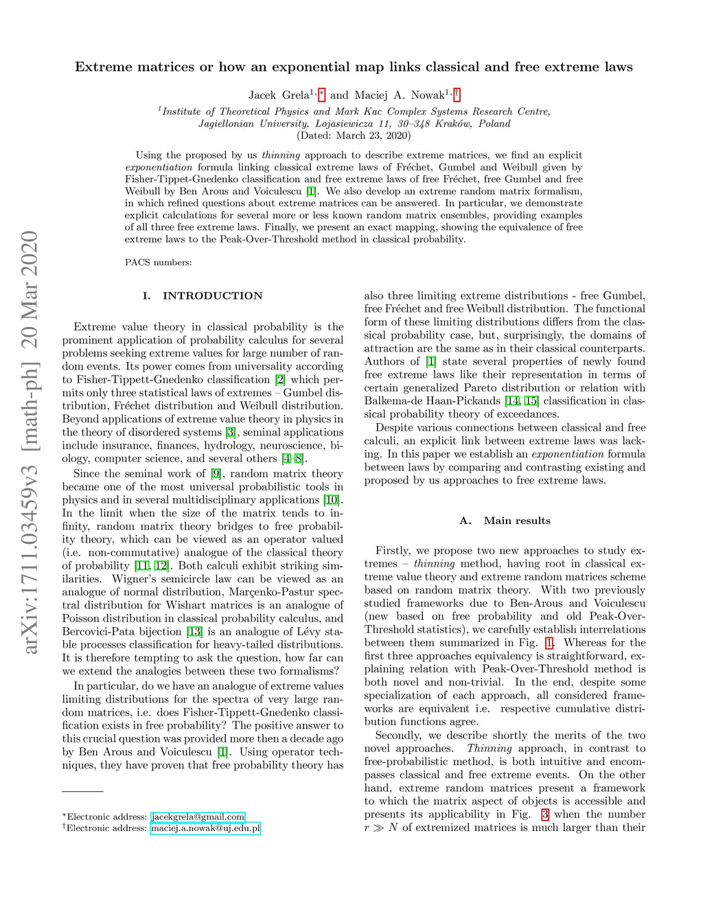 Using the proposed by us thinning approach to describe extreme matrices, we find an explicit exponentiation formula linking classical extreme laws of Fr\échet, Gumbel and Weibull given by Fisher-Tippet-Gnedenko classification and free extreme laws of free Fr\échet, free Gumbel and free Weibull by Ben Arous and Voiculescu [1]. We also develop an extreme random matrix formalism, in which refined questions about extreme matrices can be answered. In particular, we demonstrate explicit calculations for several more or less known random matrix ensembles, providing examples of all three free extreme laws. Finally, we present an exact mapping, showing the equivalence of free extreme laws to the Peak-Over-Threshold method in classical probability.