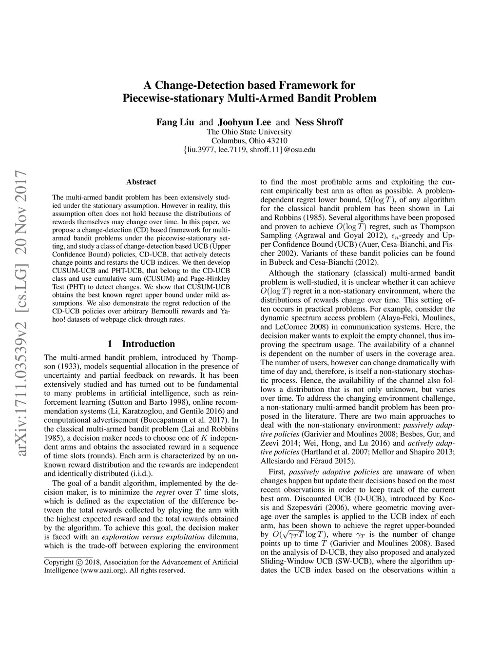The multi-armed bandit problem has been extensively studied under the stationary assumption. However in reality, this assumption often does not hold because the distributions of rewards themselves may change over time. In this paper, we propose a change-detection (CD) based framework for multi-armed bandit problems under the piecewise-stationary setting, and study a class of change-detection based UCB (Upper Confidence Bound) policies, CD-UCB, that actively detects change points and restarts the UCB indices. We then develop CUSUM-UCB and PHT-UCB, that belong to the CD-UCB class and use cumulative sum (CUSUM) and Page-Hinkley Test (PHT) to detect changes. We show that CUSUM-UCB obtains the best known regret upper bound under mild assumptions. We also demonstrate the regret reduction of the CD-UCB policies over arbitrary Bernoulli rewards and Yahoo! datasets of webpage click-through rates.