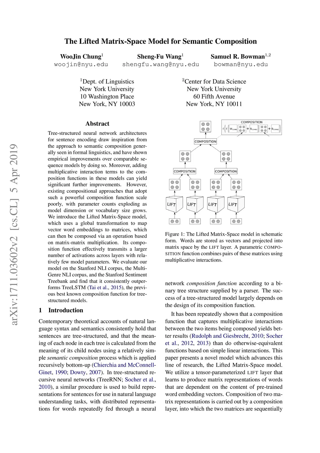 Tree-structured neural network architectures for sentence encoding draw inspiration from the approach to semantic composition generally seen in formal linguistics, and have shown empirical improvements over comparable sequence models by doing so. Moreover, adding multiplicative interaction terms to the composition functions in these models can yield significant further improvements. However, existing compositional approaches that adopt such a powerful composition function scale poorly, with parameter counts exploding as model dimension or vocabulary size grows. We introduce the Lifted Matrix-Space model, which uses a global transformation to map vector word embeddings to matrices, which can then be composed via an operation based on matrix-matrix multiplication. Its composition function effectively transmits a larger number of activations across layers with relatively few model parameters. We evaluate our model on the Stanford NLI corpus, the Multi-Genre NLI corpus, and the Stanford Sentiment Treebank and find that it consistently outperforms TreeLSTM (Tai et al., 2015), the previous best known composition function for tree-structured models.
