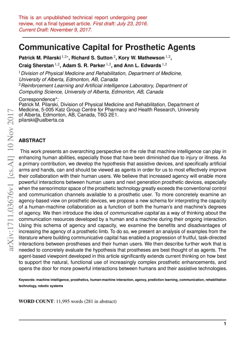 This work presents an overarching perspective on the role that machine intelligence can play in enhancing human abilities, especially those that have been diminished due to injury or illness. As a primary contribution, we develop the hypothesis that assistive devices, and specifically artificial arms and hands, can and should be viewed as agents in order for us to most effectively improve their collaboration with their human users. We believe that increased agency will enable more powerful interactions between human users and next generation prosthetic devices, especially when the sensorimotor space of the prosthetic technology greatly exceeds the conventional control and communication channels available to a prosthetic user. To more concretely examine an agency-based view on prosthetic devices, we propose a new schema for interpreting the capacity of a human-machine collaboration as a function of both the human's and machine's degrees of agency. We then introduce the idea of communicative capital as a way of thinking about the communication resources developed by a human and a machine during their ongoing interaction. Using this schema of agency and capacity, we examine the benefits and disadvantages of increasing the agency of a prosthetic limb. To do so, we present an analysis of examples from the literature where building communicative capital has enabled a progression of fruitful, task-directed interactions between prostheses and their human users. We then describe further work that is needed to concretely evaluate the hypothesis that prostheses are best thought of as agents. The agent-based viewpoint developed in this article significantly extends current thinking on how best to support the natural, functional use of increasingly complex prosthetic enhancements, and opens the door for more powerful interactions between humans and their assistive technologies.