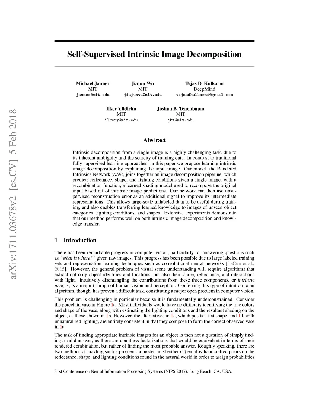 Intrinsic decomposition from a single image is a highly challenging task, due to its inherent ambiguity and the scarcity of training data. In contrast to traditional fully supervised learning approaches, in this paper we propose learning intrinsic image decomposition by explaining the input image. Our model, the Rendered Intrinsics Network (RIN), joins together an image decomposition pipeline, which predicts reflectance, shape, and lighting conditions given a single image, with a recombination function, a learned shading model used to recompose the original input based off of intrinsic image predictions. Our network can then use unsupervised reconstruction error as an additional signal to improve its intermediate representations. This allows large-scale unlabeled data to be useful during training, and also enables transferring learned knowledge to images of unseen object categories, lighting conditions, and shapes. Extensive experiments demonstrate that our method performs well on both intrinsic image decomposition and knowledge transfer.