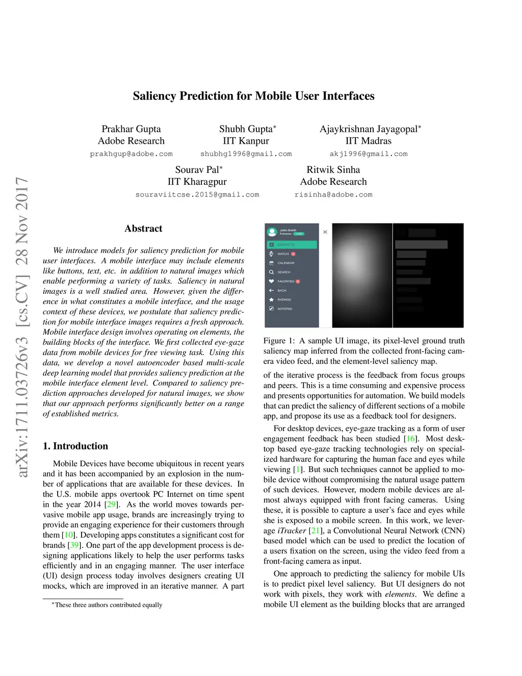 We introduce models for saliency prediction for mobile user interfaces. To enable performing a variety of tasks, a mobile interface may include elements like buttons, text, and links, in addition to natural images. Saliency in natural images is a well studied area. However, given the difference in what constitutes a mobile interface, and the usage context of these devices, we postulate that saliency prediction for mobile interface images requires a fresh approach. Mobile interface design involves operating on elements, the building blocks of the interface. In this work, we implement a system that collects eye-gaze data from mobile devices for free viewing task. Using the data collected in our experiments, we develop a novel autoencoder based multi-scale deep learning model that provides saliency prediction at the mobile interface element level. Compared to saliency prediction approaches developed for natural images, we show that our approach performs significantly better on a range of established metrics.