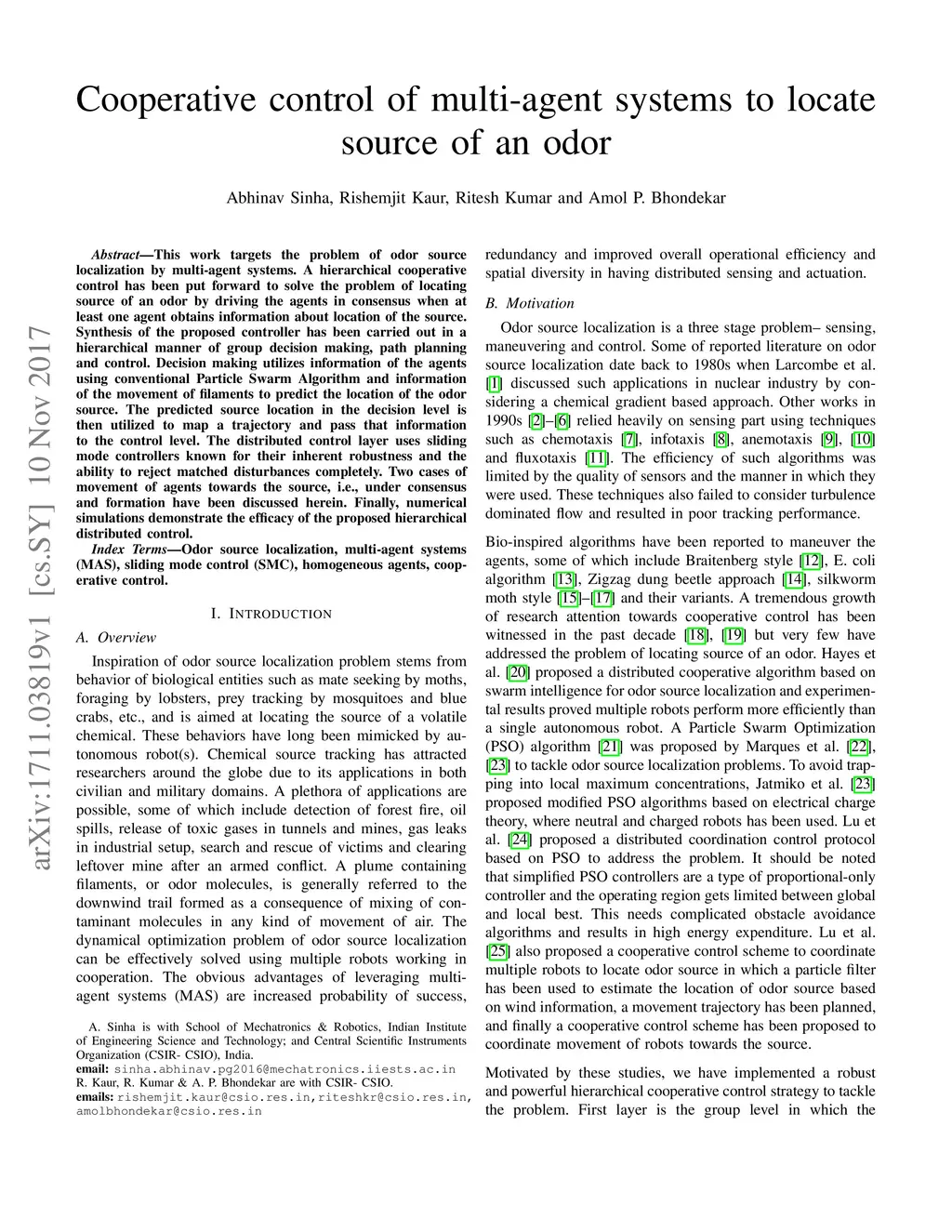 Cooperative control of multi-agent systems to locate source of an odor