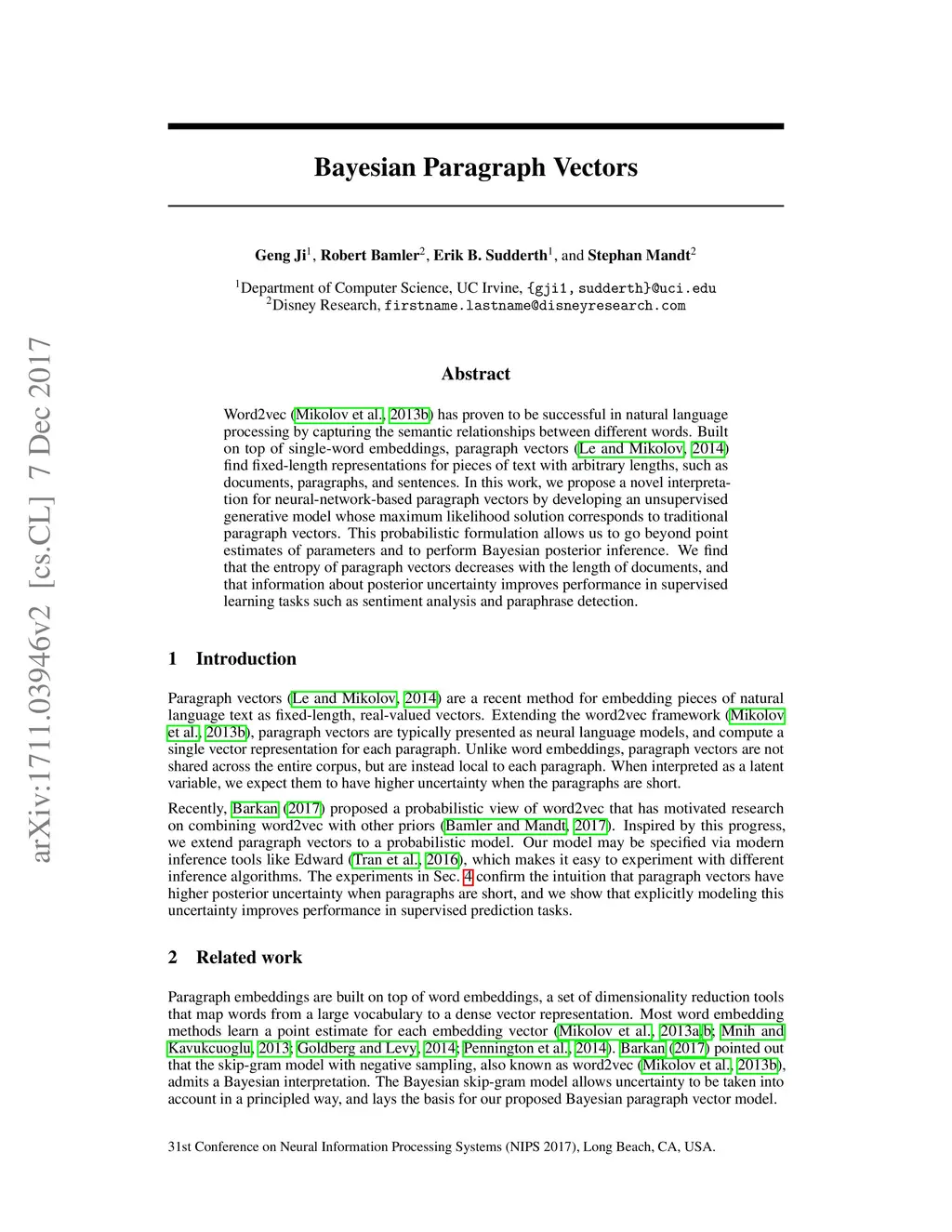 Word2vec (Mikolov et al., 2013) has proven to be successful in natural language processing by capturing the semantic relationships between different words. Built on top of single-word embeddings, paragraph vectors (Le and Mikolov, 2014) find fixed-length representations for pieces of text with arbitrary lengths, such as documents, paragraphs, and sentences. In this work, we propose a novel interpretation for neural-network-based paragraph vectors by developing an unsupervised generative model whose maximum likelihood solution corresponds to traditional paragraph vectors. This probabilistic formulation allows us to go beyond point estimates of parameters and to perform Bayesian posterior inference. We find that the entropy of paragraph vectors decreases with the length of documents, and that information about posterior uncertainty improves performance in supervised learning tasks such as sentiment analysis and paraphrase detection.