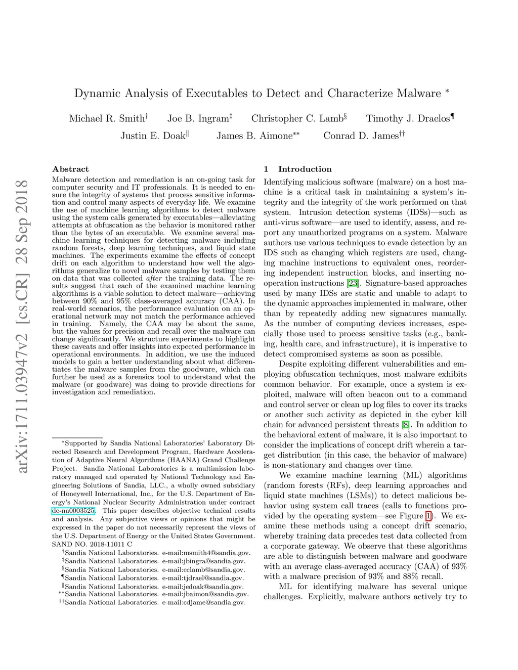 Dynamic Analysis of Executables to Detect and Characterize Malware
