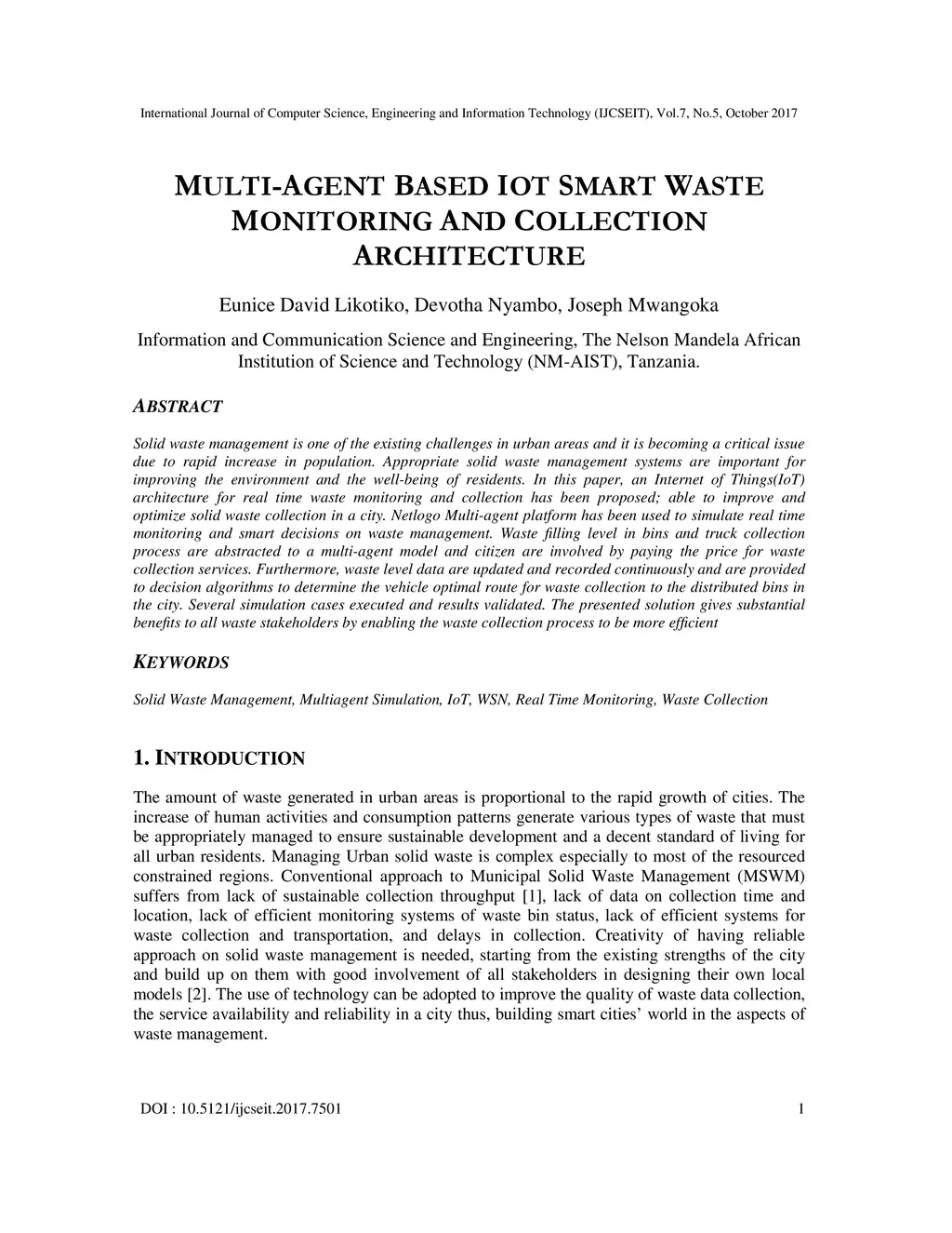 Multi-agent based IoT smart waste monitoring and collection architecture