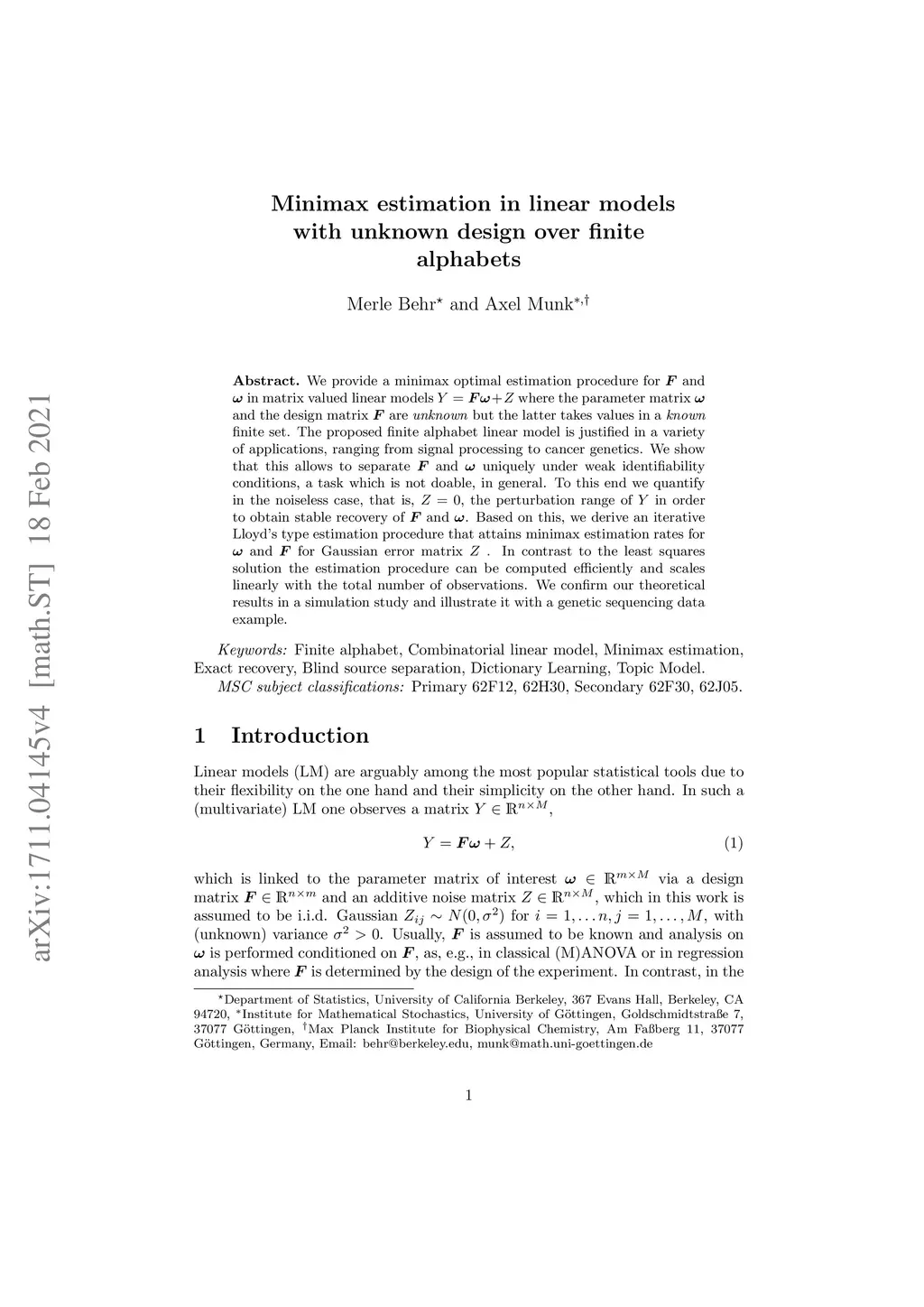We provide a minimax optimal estimation procedure for F and W in matrix valued linear models Y = F W + Z where the parameter matrix W and the design matrix F are unknown but the latter takes values in a known finite set. The proposed finite alphabet linear model is justified in a variety of applications, ranging from signal processing to cancer genetics. We show that this allows to separate F and W uniquely under weak identifiability conditions, a task which is not doable, in general. To this end we quantify in the noiseless case, that is, Z = 0, the perturbation range of Y in order to obtain stable recovery of F and W. Based on this, we derive an iterative Lloyd's type estimation procedure that attains minimax estimation rates for W and F for Gaussian error matrix Z. In contrast to the least squares solution the estimation procedure can be computed efficiently and scales linearly with the total number of observations. We confirm our theoretical results in a simulation study and illustrate it with a genetic sequencing data example.