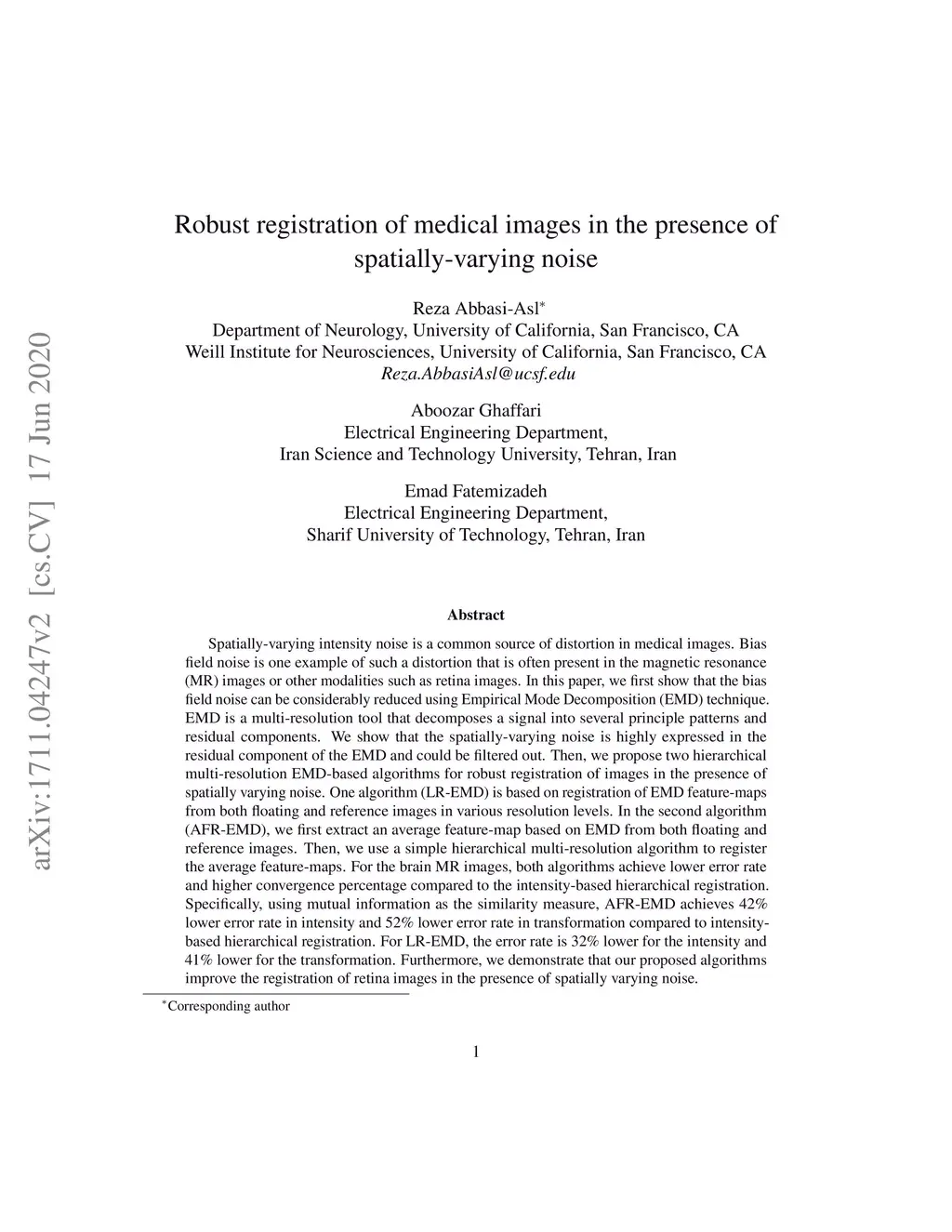 Spatially-varying intensity noise is a common source of distortion in medical images. Bias field noise is one example of such a distortion that is often present in the magnetic resonance (MR) images or other modalities such as retina images. In this paper, we first show that the bias field noise can be considerably reduced using Empirical Mode Decomposition (EMD) technique. EMD is a multi-resolution tool that decomposes a signal into several principle patterns and residual components. We show that the spatially-varying noise is highly expressed in the residual component of the EMD and could be filtered out. Then, we propose two hierarchical multi-resolution EMD-based algorithms for robust registration of images in the presence of spatially varying noise. One algorithm (LR-EMD) is based on registration of EMD feature-maps from both floating and reference images in various resolution levels. In the second algorithm (AFR-EMD), we first extract an average feature-map based on EMD from both floating and reference images. Then, we use a simple hierarchical multi-resolution algorithm to register the average feature-maps. For the brain MR images, both algorithms achieve lower error rate and higher convergence percentage compared to the intensity-based hierarchical registration. Specifically, using mutual information as the similarity measure, AFR-EMD achieves 42% lower error rate in intensity and 52% lower error rate in transformation compared to intensity-based hierarchical registration. For LR-EMD, the error rate is 32% lower for the intensity and 41% lower for the transformation. Furthermore, we demonstrate that our proposed algorithms improve the registration of retina images in the presence of spatially varying noise.