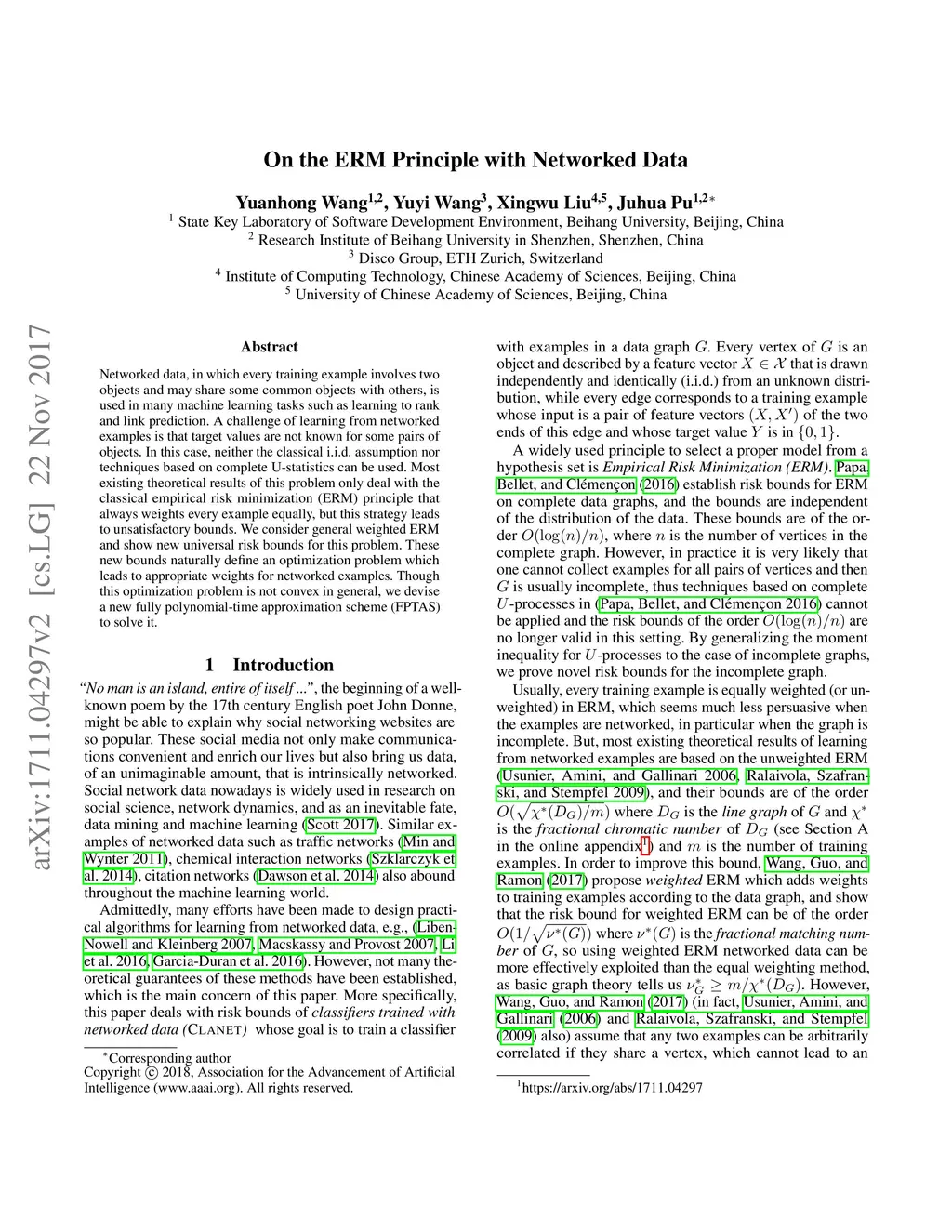 Networked data, in which every training example involves two objects and may share some common objects with others, is used in many machine learning tasks such as learning to rank and link prediction. A challenge of learning from networked examples is that target values are not known for some pairs of objects. In this case, neither the classical i.i.d.\ assumption nor techniques based on complete U-statistics can be used. Most existing theoretical results of this problem only deal with the classical empirical risk minimization (ERM) principle that always weights every example equally, but this strategy leads to unsatisfactory bounds. We consider general weighted ERM and show new universal risk bounds for this problem. These new bounds naturally define an optimization problem which leads to appropriate weights for networked examples. Though this optimization problem is not convex in general, we devise a new fully polynomial-time approximation scheme (FPTAS) to solve it.