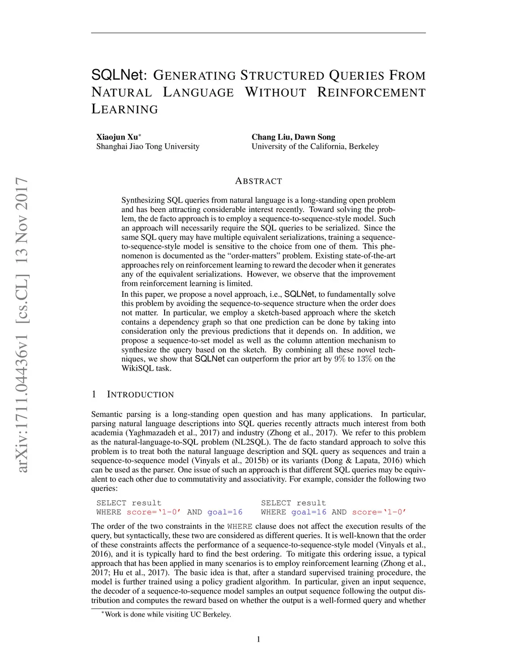 Synthesizing SQL queries from natural language is a long-standing open problem and has been attracting considerable interest recently. Toward solving the problem, the de facto approach is to employ a sequence-to-sequence-style model. Such an approach will necessarily require the SQL queries to be serialized. Since the same SQL query may have multiple equivalent serializations, training a sequence-to-sequence-style model is sensitive to the choice from one of them. This phenomenon is documented as the "order-matters" problem. Existing state-of-the-art approaches rely on reinforcement learning to reward the decoder when it generates any of the equivalent serializations. However, we observe that the improvement from reinforcement learning is limited. In this paper, we propose a novel approach, i.e., SQLNet, to fundamentally solve this problem by avoiding the sequence-to-sequence structure when the order does not matter. In particular, we employ a sketch-based approach where the sketch contains a dependency graph so that one prediction can be done by taking into consideration only the previous predictions that it depends on. In addition, we propose a sequence-to-set model as well as the column attention mechanism to synthesize the query based on the sketch. By combining all these novel techniques, we show that SQLNet can outperform the prior art by 9% to 13% on the WikiSQL task.