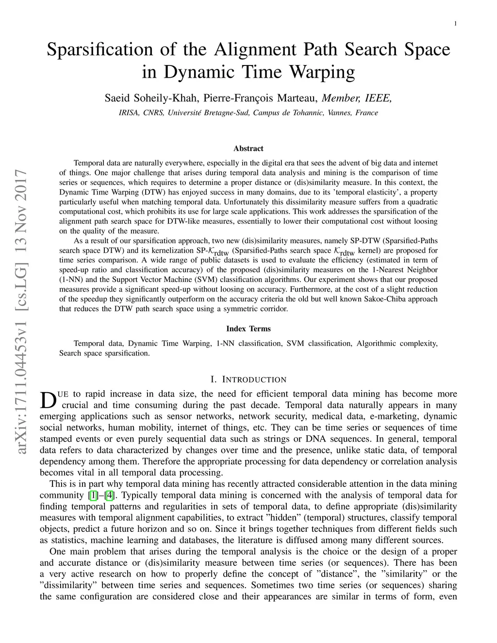 Temporal data are naturally everywhere, especially in the digital era that sees the advent of big data and internet of things. One major challenge that arises during temporal data analysis and mining is the comparison of time series or sequences, which requires to determine a proper distance or (dis)similarity measure. In this context, the Dynamic Time Warping (DTW) has enjoyed success in many domains, due to its 'temporal elasticity', a property particularly useful when matching temporal data. Unfortunately this dissimilarity measure suffers from a quadratic computational cost, which prohibits its use for large scale applications. This work addresses the sparsification of the alignment path search space for DTW-like measures, essentially to lower their computational cost without loosing on the quality of the measure. As a result of our sparsification approach, two new (dis)similarity measures, namely SP-DTW (Sparsified-Paths search space DTW) and its kernelization SP-K rdtw (Sparsified-Paths search space K rdtw kernel) are proposed for time series comparison. A wide range of public datasets is used to evaluate the efficiency (estimated in term of speed-up ratio and classification accuracy) of the proposed (dis)similarity measures on the 1-Nearest Neighbor (1-NN) and the Support Vector Machine (SVM) classification algorithms. Our experiment shows that our proposed measures provide a significant speed-up without loosing on accuracy. Furthermore, at the cost of a slight reduction of the speedup they significantly outperform on the accuracy criteria the old but well known Sakoe-Chiba approach that reduces the DTW path search space using a symmetric corridor.