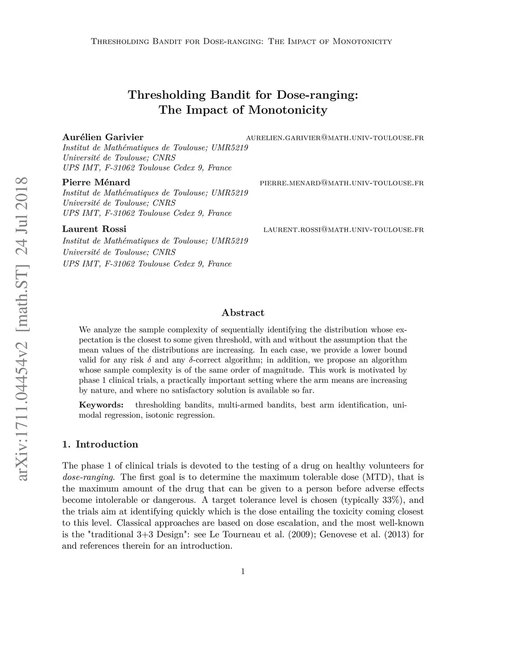 We analyze the sample complexity of the thresholding bandit problem, with and without the assumption that the mean values of the arms are increasing. In each case, we provide a lower bound valid for any risk and any -correct algorithm; in addition, we propose an algorithm whose sample complexity is of the same order of magnitude for small risks. This work is motivated by phase 1 clinical trials, a practically important setting where the arm means are increasing by nature, and where no satisfactory solution is available so far.