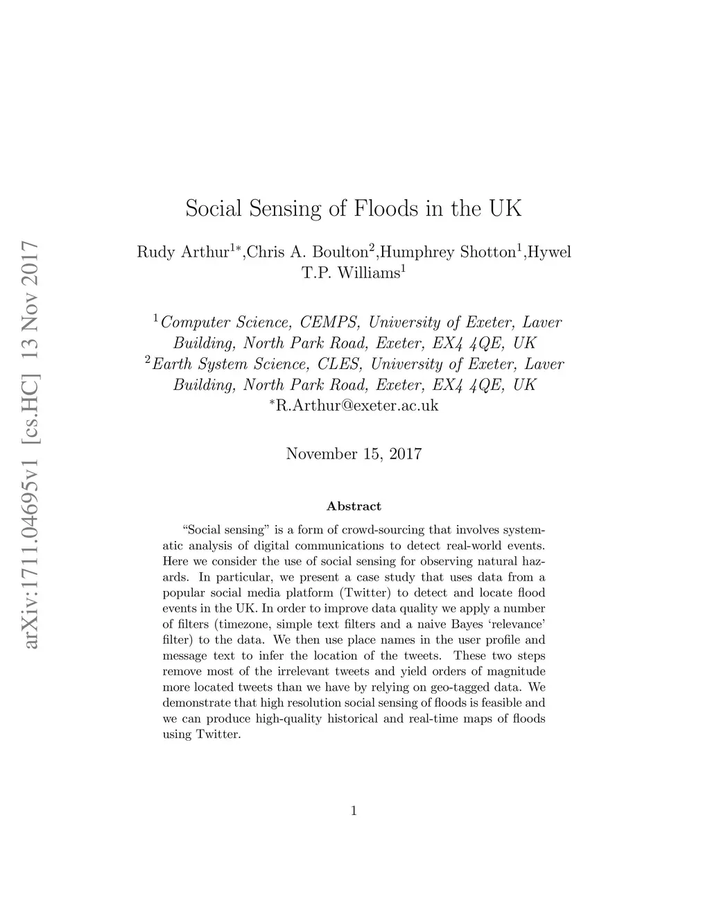 "Social sensing" is a form of crowd-sourcing that involves systematic analysis of digital communications to detect real-world events. Here we consider the use of social sensing for observing natural hazards. In particular, we present a case study that uses data from a popular social media platform (Twitter) to detect and locate flood events in the UK. In order to improve data quality we apply a number of filters (timezone, simple text filters and a naive Bayes `relevance' filter) to the data. We then use place names in the user profile and message text to infer the location of the tweets. These two steps remove most of the irrelevant tweets and yield orders of magnitude more located tweets than we have by relying on geo-tagged data. We demonstrate that high resolution social sensing of floods is feasible and we can produce high-quality historical and real-time maps of floods using Twitter.