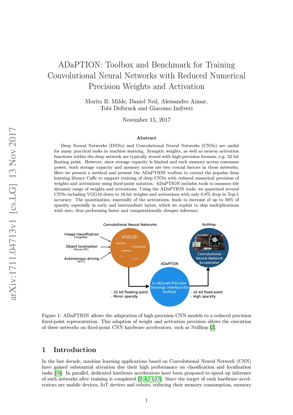 Deep Neural Networks (DNNs) and Convolutional Neural Networks (CNNs) are useful for many practical tasks in machine learning. Synaptic weights, as well as neuron activation functions within the deep network are typically stored with high-precision formats, e.g. 32 bit floating point. However, since storage capacity is limited and each memory access consumes power, both storage capacity and memory access are two crucial factors in these networks. Here we present a method and present the ADaPTION toolbox to extend the popular deep learning library Caffe to support training of deep CNNs with reduced numerical precision of weights and activations using fixed point notation. ADaPTION includes tools to measure the dynamic range of weights and activations. Using the ADaPTION tools, we quantized several CNNs including VGG16 down to 16-bit weights and activations with only 0.8% drop in Top-1 accuracy. The quantization, especially of the activations, leads to increase of up to 50% of sparsity especially in early and intermediate layers, which we exploit to skip multiplications with zero, thus performing faster and computationally cheaper inference.