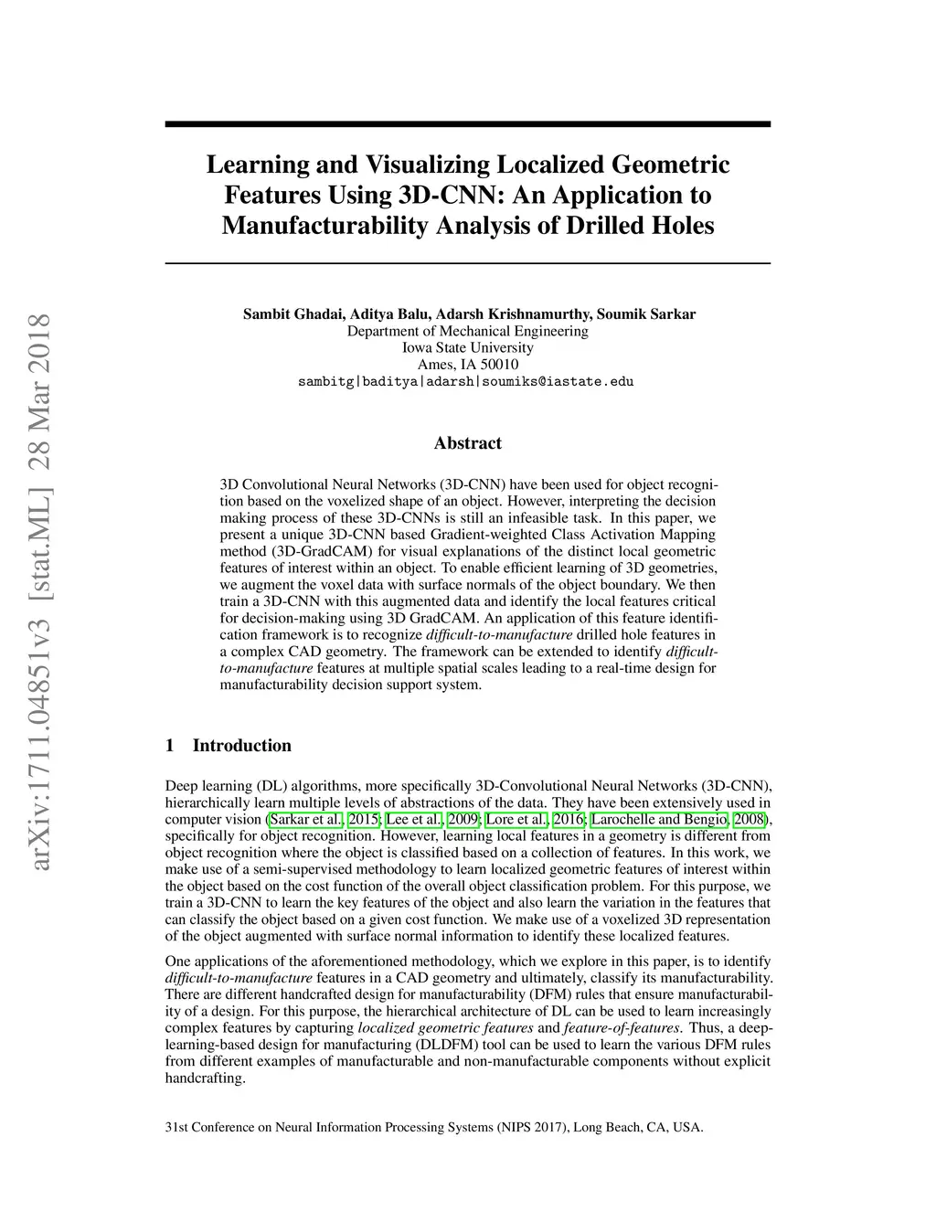 3D Convolutional Neural Networks (3D-CNN) have been used for object recognition based on the voxelized shape of an object. However, interpreting the decision making process of these 3D-CNNs is still an infeasible task. In this paper, we present a unique 3D-CNN based Gradient-weighted Class Activation Mapping method (3D-GradCAM) for visual explanations of the distinct local geometric features of interest within an object. To enable efficient learning of 3D geometries, we augment the voxel data with surface normals of the object boundary. We then train a 3D-CNN with this augmented data and identify the local features critical for decision-making using 3D GradCAM. An application of this feature identification framework is to recognize difficult-to-manufacture drilled hole features in a complex CAD geometry. The framework can be extended to identify difficult-to-manufacture features at multiple spatial scales leading to a real-time design for manufacturability decision support system.