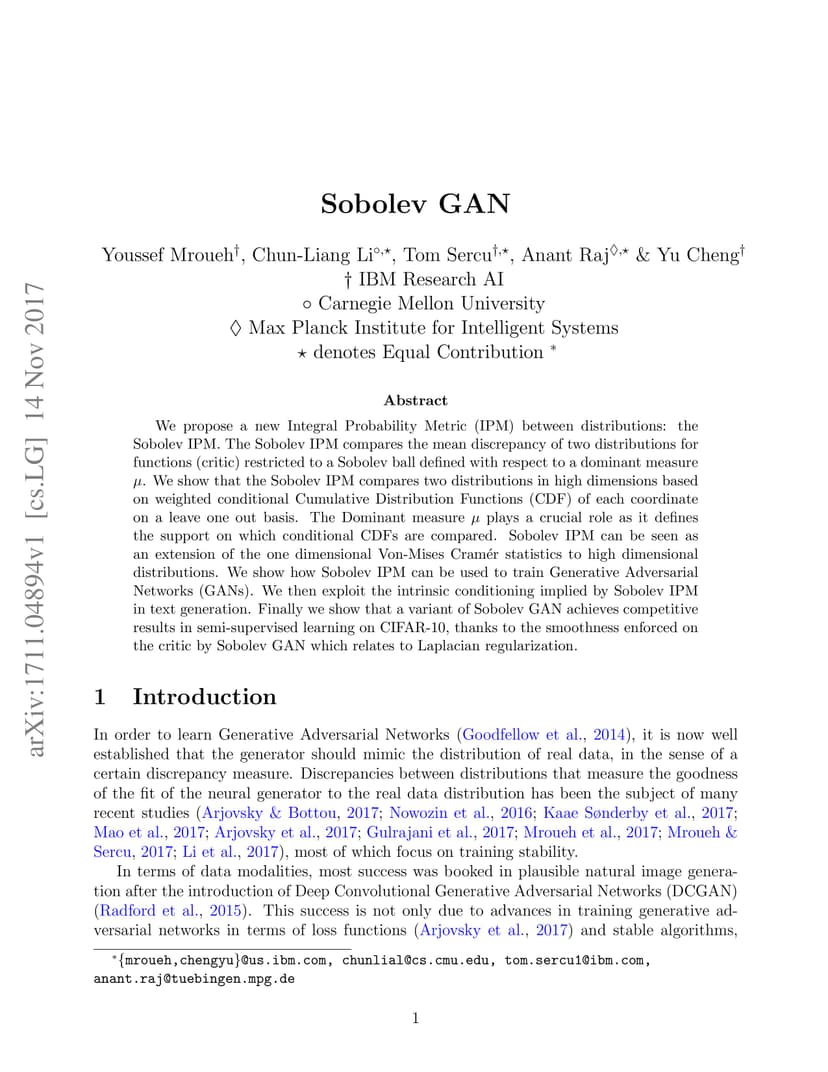 We propose a new Integral Probability Metric (IPM) between distributions: the Sobolev IPM. The Sobolev IPM compares the mean discrepancy of two distributions for functions (critic) restricted to a Sobolev ball defined with respect to a dominant measure . We show that the Sobolev IPM compares two distributions in high dimensions based on weighted conditional Cumulative Distribution Functions (CDF) of each coordinate on a leave one out basis. The Dominant measure plays a crucial role as it defines the support on which conditional CDFs are compared. Sobolev IPM can be seen as an extension of the one dimensional Von-Mises Cram\ér statistics to high dimensional distributions. We show how Sobolev IPM can be used to train Generative Adversarial Networks (GANs). We then exploit the intrinsic conditioning implied by Sobolev IPM in text generation. Finally we show that a variant of Sobolev GAN achieves competitive results in semi-supervised learning on CIFAR-10, thanks to the smoothness enforced on the critic by Sobolev GAN which relates to Laplacian regularization.