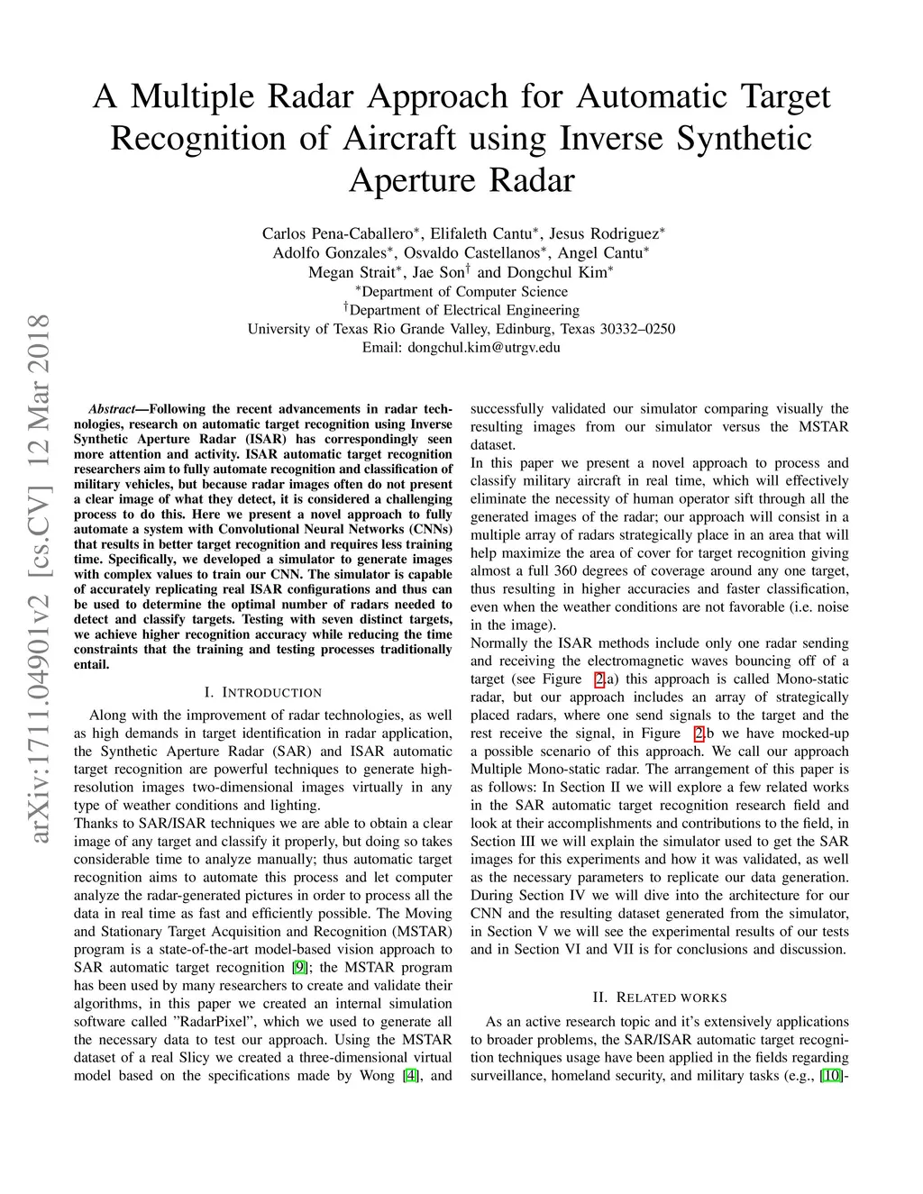 Along with the improvement of radar technologies, Automatic Target Recognition (ATR) using Synthetic Aperture Radar (SAR) and Inverse SAR (ISAR) has come to be an active research area. SAR/ISAR are radar techniques to generate a two-dimensional high-resolution image of a target. Unlike other similar experiments using Convolutional Neural Networks (CNN) to solve this problem, we utilize an unusual approach that leads to better performance and faster training times. Our CNN uses complex values generated by a simulation to train the network; additionally, we utilize a multi-radar approach to increase the accuracy of the training and testing processes, thus resulting in higher accuracies than the other papers working on SAR/ISAR ATR. We generated our dataset with 7 different aircraft models with a radar simulator we developed called RadarPixel; it is a Windows GUI program implemented using Matlab and Java programming, the simulator is capable of accurately replicating a real SAR/ISAR configurations. Our objective is to utilize our multi-radar technique and determine the optimal number of radars needed to detect and classify targets.