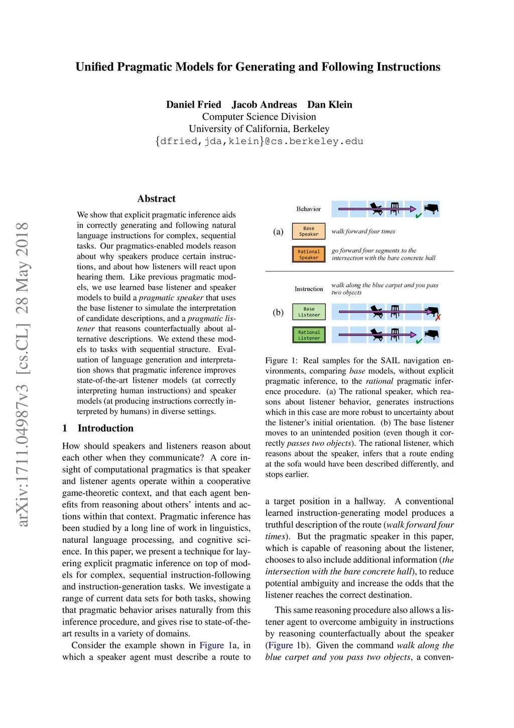 We show that explicit pragmatic inference aids in correctly generating and following natural language instructions for complex, sequential tasks. Our pragmatics-enabled models reason about why speakers produce certain instructions, and about how listeners will react upon hearing them. Like previous pragmatic models, we use learned base listener and speaker models to build a pragmatic speaker that uses the base listener to simulate the interpretation of candidate descriptions, and a pragmatic listener that reasons counterfactually about alternative descriptions. We extend these models to tasks with sequential structure. Evaluation of language generation and interpretation shows that pragmatic inference improves state-of-the-art listener models (at correctly interpreting human instructions) and speaker models (at producing instructions correctly interpreted by humans) in diverse settings.