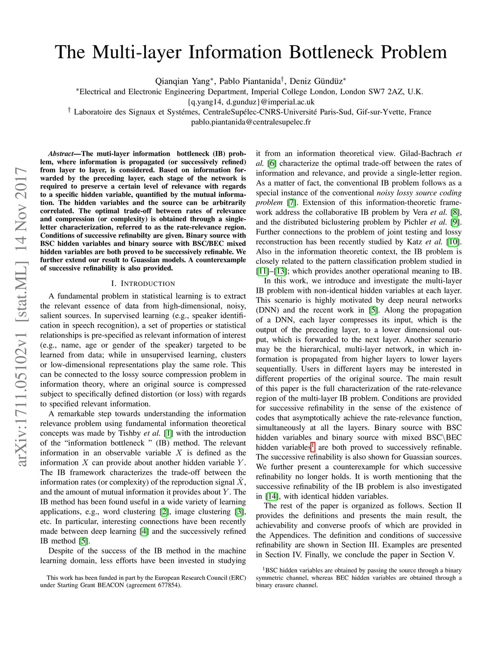 The muti-layer information bottleneck (IB) problem, where information is propagated (or successively refined) from layer to layer, is considered. Based on information forwarded by the preceding layer, each stage of the network is required to preserve a certain level of relevance with regards to a specific hidden variable, quantified by the mutual information. The hidden variables and the source can be arbitrarily correlated. The optimal trade-off between rates of relevance and compression (or complexity) is obtained through a single-letter characterization, referred to as the rate-relevance region. Conditions of successive refinabilty are given. Binary source with BSC hidden variables and binary source with BSC/BEC mixed hidden variables are both proved to be successively refinable. We further extend our result to Guassian models. A counterexample of successive refinability is also provided.