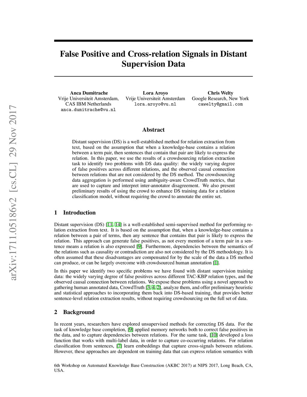 Distant supervision (DS) is a well-established method for relation extraction from text, based on the assumption that when a knowledge-base contains a relation between a term pair, then sentences that contain that pair are likely to express the relation. In this paper, we use the results of a crowdsourcing relation extraction task to identify two problems with DS data quality: the widely varying degree of false positives across different relations, and the observed causal connection between relations that are not considered by the DS method. The crowdsourcing data aggregation is performed using ambiguity-aware CrowdTruth metrics, that are used to capture and interpret inter-annotator disagreement. We also present preliminary results of using the crowd to enhance DS training data for a relation classification model, without requiring the crowd to annotate the entire set.