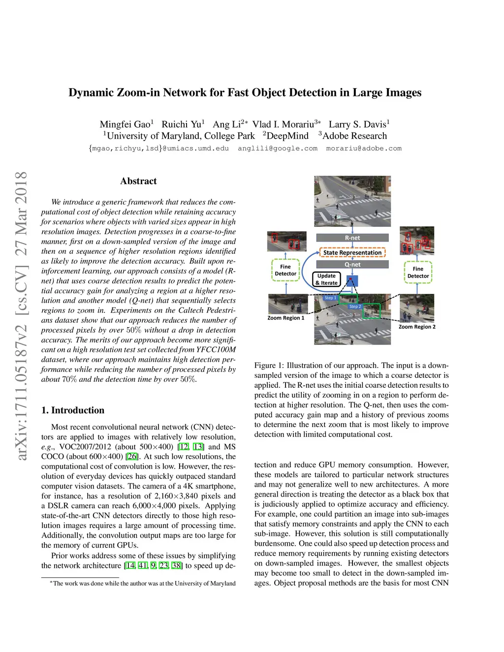 We introduce a generic framework that reduces the computational cost of object detection while retaining accuracy for scenarios where objects with varied sizes appear in high resolution images. Detection progresses in a coarse-to-fine manner, first on a down-sampled version of the image and then on a sequence of higher resolution regions identified as likely to improve the detection accuracy. Built upon reinforcement learning, our approach consists of a model (R-net) that uses coarse detection results to predict the potential accuracy gain for analyzing a region at a higher resolution and another model (Q-net) that sequentially selects regions to zoom in. Experiments on the Caltech Pedestrians dataset show that our approach reduces the number of processed pixels by over 50% without a drop in detection accuracy. The merits of our approach become more significant on a high resolution test set collected from YFCC100M dataset, where our approach maintains high detection performance while reducing the number of processed pixels by about 70% and the detection time by over 50%.