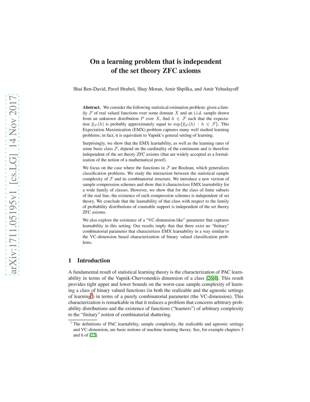 We consider the following statistical estimation problem: given a family F of real valued functions over some domain X and an i.i.d. sample drawn from an unknown distribution P over X, find h in F such that the expectation of h w.r.t. P is probably approximately equal to the supremum over expectations on members of F. This Expectation Maximization (EMX) problem captures many well studied learning problems; in fact, it is equivalent to Vapnik's general setting of learning. Surprisingly, we show that the EMX learnability, as well as the learning rates of some basic class F, depend on the cardinality of the continuum and is therefore independent of the set theory ZFC axioms (that are widely accepted as a formalization of the notion of a mathematical proof). We focus on the case where the functions in F are Boolean, which generalizes classification problems. We study the interaction between the statistical sample complexity of F and its combinatorial structure. We introduce a new version of sample compression schemes and show that it characterizes EMX learnability for a wide family of classes. However, we show that for the class of finite subsets of the real line, the existence of such compression schemes is independent of set theory. We conclude that the learnability of that class with respect to the family of probability distributions of countable support is independent of the set theory ZFC axioms. We also explore the existence of a "VC-dimension-like" parameter that captures learnability in this setting. Our results imply that that there exist no "finitary" combinatorial parameter that characterizes EMX learnability in a way similar to the VC-dimension based characterization of binary valued classification problems.