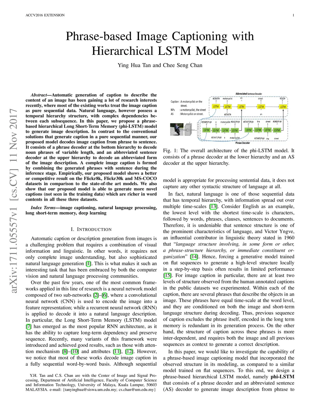 Automatic generation of caption to describe the content of an image has been gaining a lot of research interests recently, where most of the existing works treat the image caption as pure sequential data. Natural language, however possess a temporal hierarchy structure, with complex dependencies between each subsequence. In this paper, we propose a phrase-based hierarchical Long Short-Term Memory (phi-LSTM) model to generate image description. In contrast to the conventional solutions that generate caption in a pure sequential manner, our proposed model decodes image caption from phrase to sentence. It consists of a phrase decoder at the bottom hierarchy to decode noun phrases of variable length, and an abbreviated sentence decoder at the upper hierarchy to decode an abbreviated form of the image description. A complete image caption is formed by combining the generated phrases with sentence during the inference stage. Empirically, our proposed model shows a better or competitive result on the Flickr8k, Flickr30k and MS-COCO datasets in comparison to the state-of-the art models. We also show that our proposed model is able to generate more novel captions (not seen in the training data) which are richer in word contents in all these three datasets.