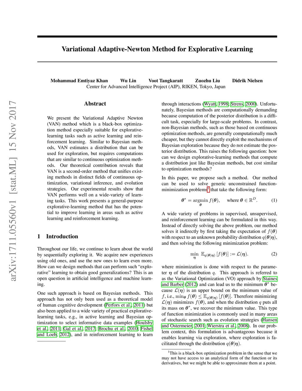 We present the Variational Adaptive Newton (VAN) method which is a black-box optimization method especially suitable for explorative-learning tasks such as active learning and reinforcement learning. Similar to Bayesian methods, VAN estimates a distribution that can be used for exploration, but requires computations that are similar to continuous optimization methods. Our theoretical contribution reveals that VAN is a second-order method that unifies existing methods in distinct fields of continuous optimization, variational inference, and evolution strategies. Our experimental results show that VAN performs well on a wide-variety of learning tasks. This work presents a general-purpose explorative-learning method that has the potential to improve learning in areas such as active learning and reinforcement learning.