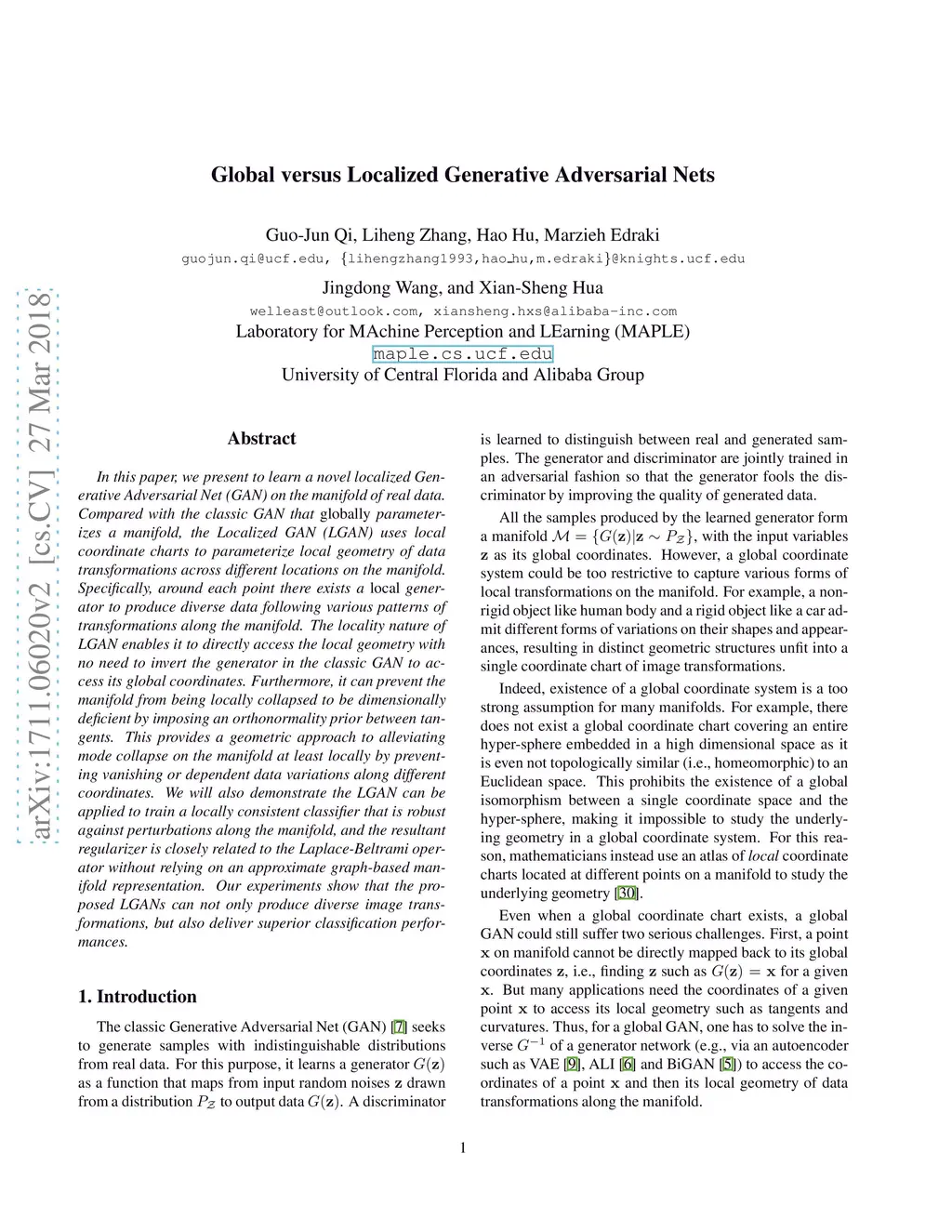 In this paper, we present a novel localized Generative Adversarial Net (GAN) to learn on the manifold of real data. Compared with the classic GAN that {\em globally} parameterizes a manifold, the Localized GAN (LGAN) uses local coordinate charts to parameterize distinct local geometry of how data points can transform at different locations on the manifold. Specifically, around each point there exists a {\em local} generator that can produce data following diverse patterns of transformations on the manifold. The locality nature of LGAN enables local generators to adapt to and directly access the local geometry without need to invert the generator in a global GAN. Furthermore, it can prevent the manifold from being locally collapsed to a dimensionally deficient tangent subspace by imposing an orthonormality prior between tangents. This provides a geometric approach to alleviating mode collapse at least locally on the manifold by imposing independence between data transformations in different tangent directions. We will also demonstrate the LGAN can be applied to train a robust classifier that prefers locally consistent classification decisions on the manifold, and the resultant regularizer is closely related with the Laplace-Beltrami operator. Our experiments show that the proposed LGANs can not only produce diverse image transformations, but also deliver superior classification performances.