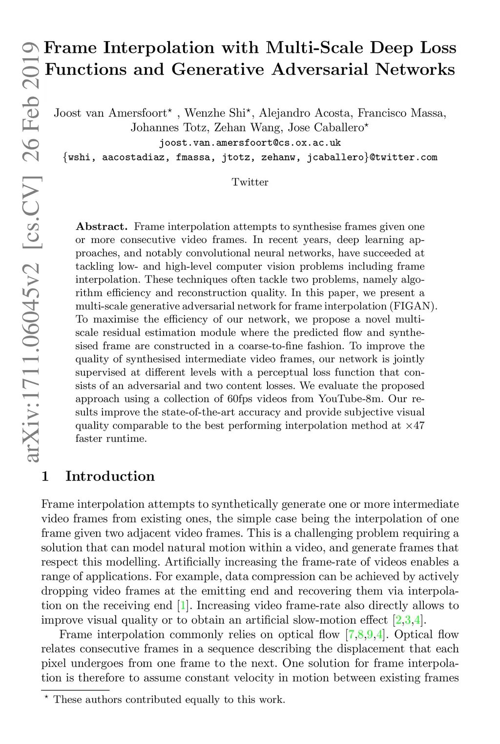 Frame interpolation attempts to synthesise frames given one or more consecutive video frames. In recent years, deep learning approaches, and notably convolutional neural networks, have succeeded at tackling low- and high-level computer vision problems including frame interpolation. These techniques often tackle two problems, namely algorithm efficiency and reconstruction quality. In this paper, we present a multi-scale generative adversarial network for frame interpolation (\mbox{FIGAN}). To maximise the efficiency of our network, we propose a novel multi-scale residual estimation module where the predicted flow and synthesised frame are constructed in a coarse-to-fine fashion. To improve the quality of synthesised intermediate video frames, our network is jointly supervised at different levels with a perceptual loss function that consists of an adversarial and two content losses. We evaluate the proposed approach using a collection of 60fps videos from YouTube-8m. Our results improve the state-of-the-art accuracy and provide subjective visual quality comparable to the best performing interpolation method at x47 faster runtime.