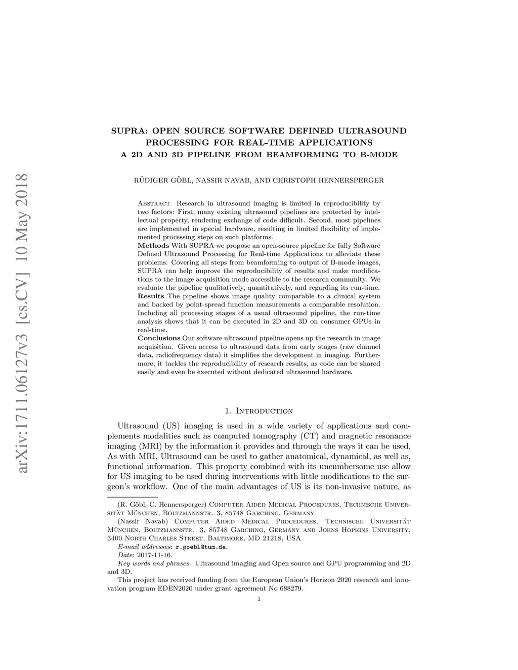 Research in ultrasound imaging is limited in reproducibility by two factors: First, many existing ultrasound pipelines are protected by intellectual property, rendering exchange of code difficult. Second, most pipelines are implemented in special hardware, resulting in limited flexibility of implemented processing steps on such platforms. Methods: With SUPRA we propose an open-source pipeline for fully Software Defined Ultrasound Processing for Real-time Applications to alleviate these problems. Covering all steps from beamforming to output of B-mode images, SUPRA can help improve the reproducibility of results and make modifications to the image acquisition mode accessible to the research community. We evaluate the pipeline qualitatively, quantitatively, and regarding its run-time. Results: The pipeline shows image quality comparable to a clinical system and backed by point-spread function measurements a comparable resolution. Including all processing stages of a usual ultrasound pipeline, the run-time analysis shows that it can be executed in 2D and 3D on consumer GPUs in real-time. Conclusions: Our software ultrasound pipeline opens up the research in image acquisition. Given access to ultrasound data from early stages (raw channel data, radiofrequency data) it simplifies the development in imaging. Furthermore, it tackles the reproducibility of research results, as code can be shared easily and even be executed without dedicated ultrasound hardware.