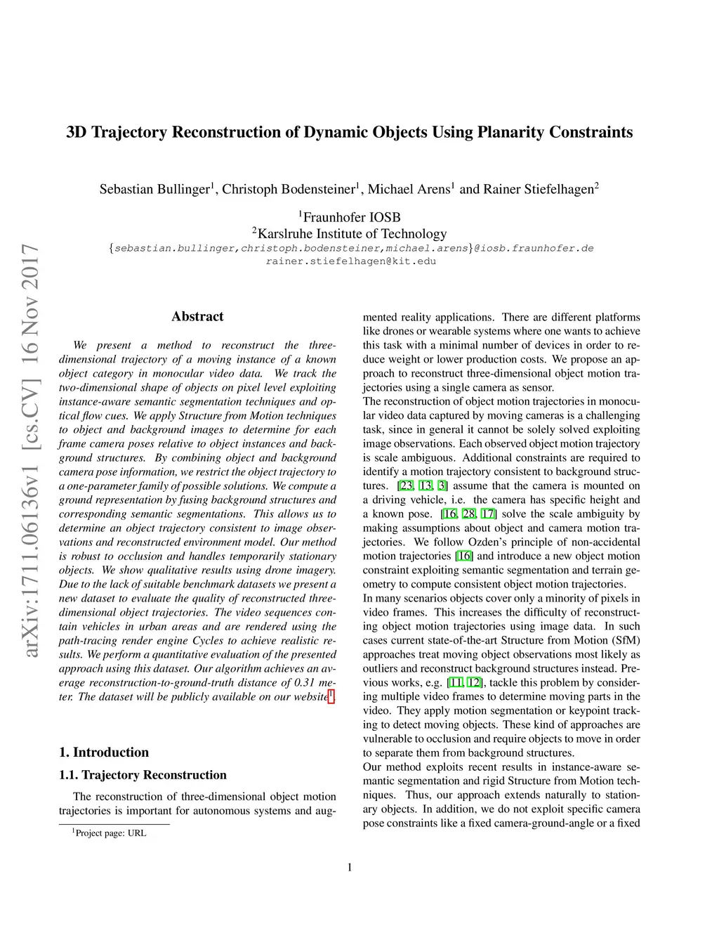 3D Trajectory Reconstruction of Dynamic Objects Using Planarity