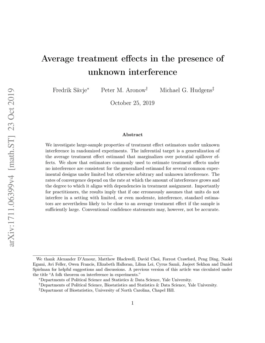 We investigate large-sample properties of treatment effect estimators under unknown interference in randomized experiments. The inferential target is a generalization of the average treatment effect estimand that marginalizes over potential spillover effects. We show that estimators commonly used to estimate treatment effects under no interference are consistent for the generalized estimand for several common experimental designs under limited but otherwise arbitrary and unknown interference. The rates of convergence depend on the rate at which the amount of interference grows and the degree to which it aligns with dependencies in treatment assignment. Importantly for practitioners, the results imply that if one erroneously assumes that units do not interfere in a setting with limited, or even moderate, interference, standard estimators are nevertheless likely to be close to an average treatment effect if the sample is sufficiently large. Conventional confidence statements may, however, not be accurate.