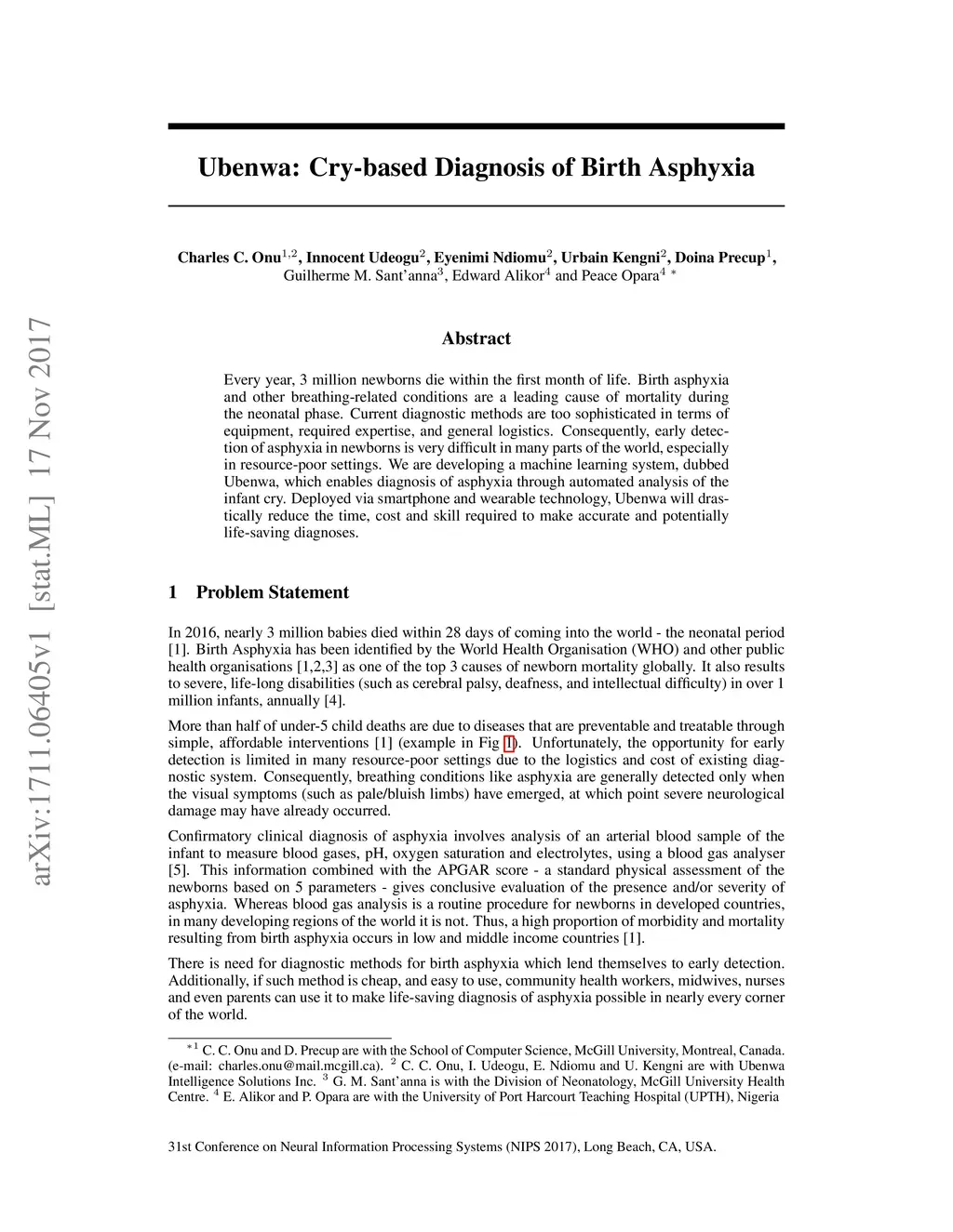 Every year, 3 million newborns die within the first month of life. Birth asphyxia and other breathing-related conditions are a leading cause of mortality during the neonatal phase. Current diagnostic methods are too sophisticated in terms of equipment, required expertise, and general logistics. Consequently, early detection of asphyxia in newborns is very difficult in many parts of the world, especially in resource-poor settings. We are developing a machine learning system, dubbed Ubenwa, which enables diagnosis of asphyxia through automated analysis of the infant cry. Deployed via smartphone and wearable technology, Ubenwa will drastically reduce the time, cost and skill required to make accurate and potentially life-saving diagnoses.