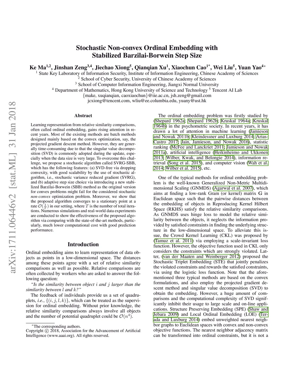 Stochastic Non-convex Ordinal Embedding with Stabilized Barzilai-Borwein