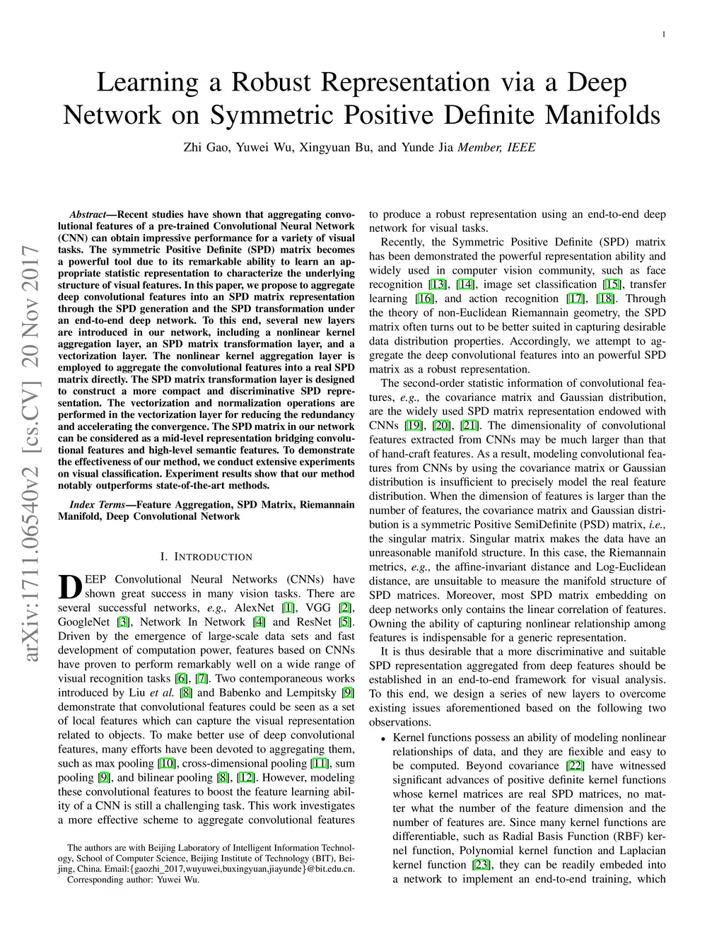 Recent studies have shown that aggregating convolutional features of a pre-trained Convolutional Neural Network (CNN) can obtain impressive performance for a variety of visual tasks. The symmetric Positive Definite (SPD) matrix becomes a powerful tool due to its remarkable ability to learn an appropriate statistic representation to characterize the underlying structure of visual features. In this paper, we propose to aggregate deep convolutional features into an SPD matrix representation through the SPD generation and the SPD transformation under an end-to-end deep network. To this end, several new layers are introduced in our network, including a nonlinear kernel aggregation layer, an SPD matrix transformation layer, and a vectorization layer. The nonlinear kernel aggregation layer is employed to aggregate the convolutional features into a real SPD matrix directly. The SPD matrix transformation layer is designed to construct a more compact and discriminative SPD representation. The vectorization and normalization operations are performed in the vectorization layer for reducing the redundancy and accelerating the convergence. The SPD matrix in our network can be considered as a mid-level representation bridging convolutional features and high-level semantic features. To demonstrate the effectiveness of our method, we conduct extensive experiments on visual classification. Experiment results show that our method notably outperforms state-of-the-art methods.