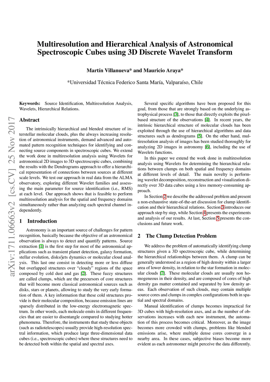 The intrinsically hierarchical and blended structure of interstellar molecular clouds, plus the always increasing resolution of astronomical instruments, demand advanced and automated pattern recognition techniques for identifying and connecting source components in spectroscopic cubes. We extend the work done in multiresolution analysis using Wavelets for astronomical 2D images to 3D spectroscopic cubes, combining the results with the Dendrograms approach to offer a hierarchical representation of connections between sources at different scale levels. We test our approach in real data from the ALMA observatory, exploring different Wavelet families and assessing the main parameter for source identification (i.e., RMS) at each level. Our approach shows that is feasible to perform multiresolution analysis for the spatial and frequency domains simultaneously rather than analyzing each spectral channel independently.