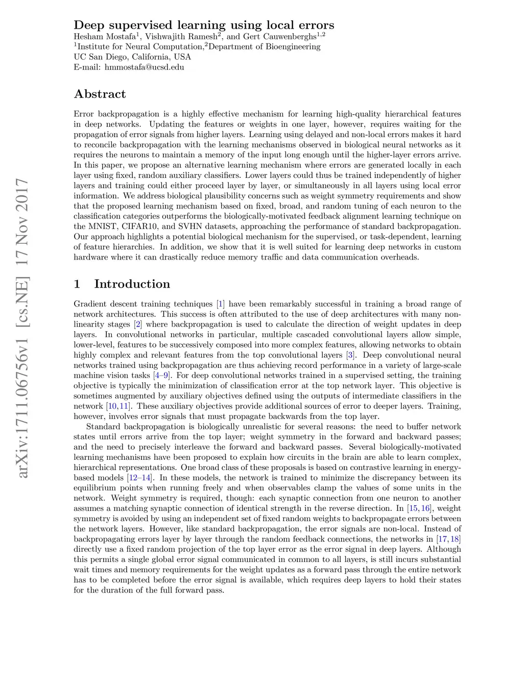 Error backpropagation is a highly effective mechanism for learning high-quality hierarchical features in deep networks. Updating the features or weights in one layer, however, requires waiting for the propagation of error signals from higher layers. Learning using delayed and non-local errors makes it hard to reconcile backpropagation with the learning mechanisms observed in biological neural networks as it requires the neurons to maintain a memory of the input long enough until the higher-layer errors arrive. In this paper, we propose an alternative learning mechanism where errors are generated locally in each layer using fixed, random auxiliary classifiers. Lower layers could thus be trained independently of higher layers and training could either proceed layer by layer, or simultaneously in all layers using local error information. We address biological plausibility concerns such as weight symmetry requirements and show that the proposed learning mechanism based on fixed, broad, and random tuning of each neuron to the classification categories outperforms the biologically-motivated feedback alignment learning technique on the MNIST, CIFAR10, and SVHN datasets, approaching the performance of standard backpropagation. Our approach highlights a potential biological mechanism for the supervised, or task-dependent, learning of feature hierarchies. In addition, we show that it is well suited for learning deep networks in custom hardware where it can drastically reduce memory traffic and data communication overheads.