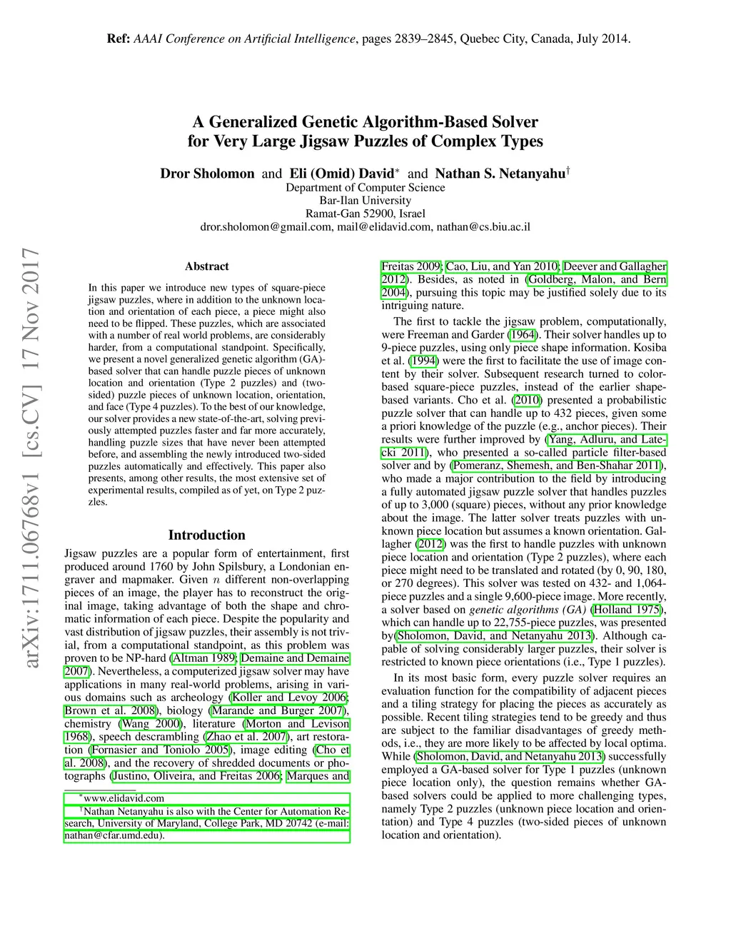 In this paper we introduce new types of square-piece jigsaw puzzles, where in addition to the unknown location and orientation of each piece, a piece might also need to be flipped. These puzzles, which are associated with a number of real world problems, are considerably harder, from a computational standpoint. Specifically, we present a novel generalized genetic algorithm (GA)-based solver that can handle puzzle pieces of unknown location and orientation (Type 2 puzzles) and (two-sided) puzzle pieces of unknown location, orientation, and face (Type 4 puzzles). To the best of our knowledge, our solver provides a new state-of-the-art, solving previously attempted puzzles faster and far more accurately, handling puzzle sizes that have never been attempted before, and assembling the newly introduced two-sided puzzles automatically and effectively. This paper also presents, among other results, the most extensive set of experimental results, compiled as of yet, on Type 2 puzzles.