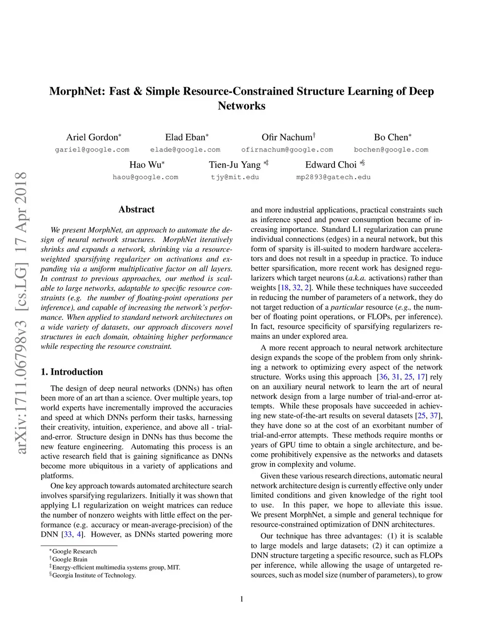 MorphNet: Fast & Simple Resource-Constrained Structure Learning of Deep