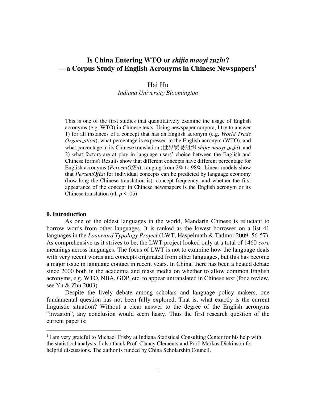 Is China Entering WTO or shijie maoyi zuzhi--a Corpus Study of English