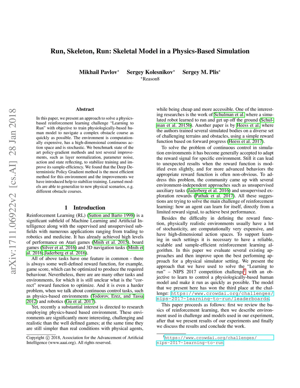 In this paper, we present our approach to solve a physics-based reinforcement learning challenge "Learning to Run" with objective to train physiologically-based human model to navigate a complex obstacle course as quickly as possible. The environment is computationally expensive, has a high-dimensional continuous action space and is stochastic. We benchmark state of the art policy-gradient methods and test several improvements, such as layer normalization, parameter noise, action and state reflecting, to stabilize training and improve its sample-efficiency. We found that the Deep Deterministic Policy Gradient method is the most efficient method for this environment and the improvements we have introduced help to stabilize training. Learned models are able to generalize to new physical scenarios, e.g. different obstacle courses.