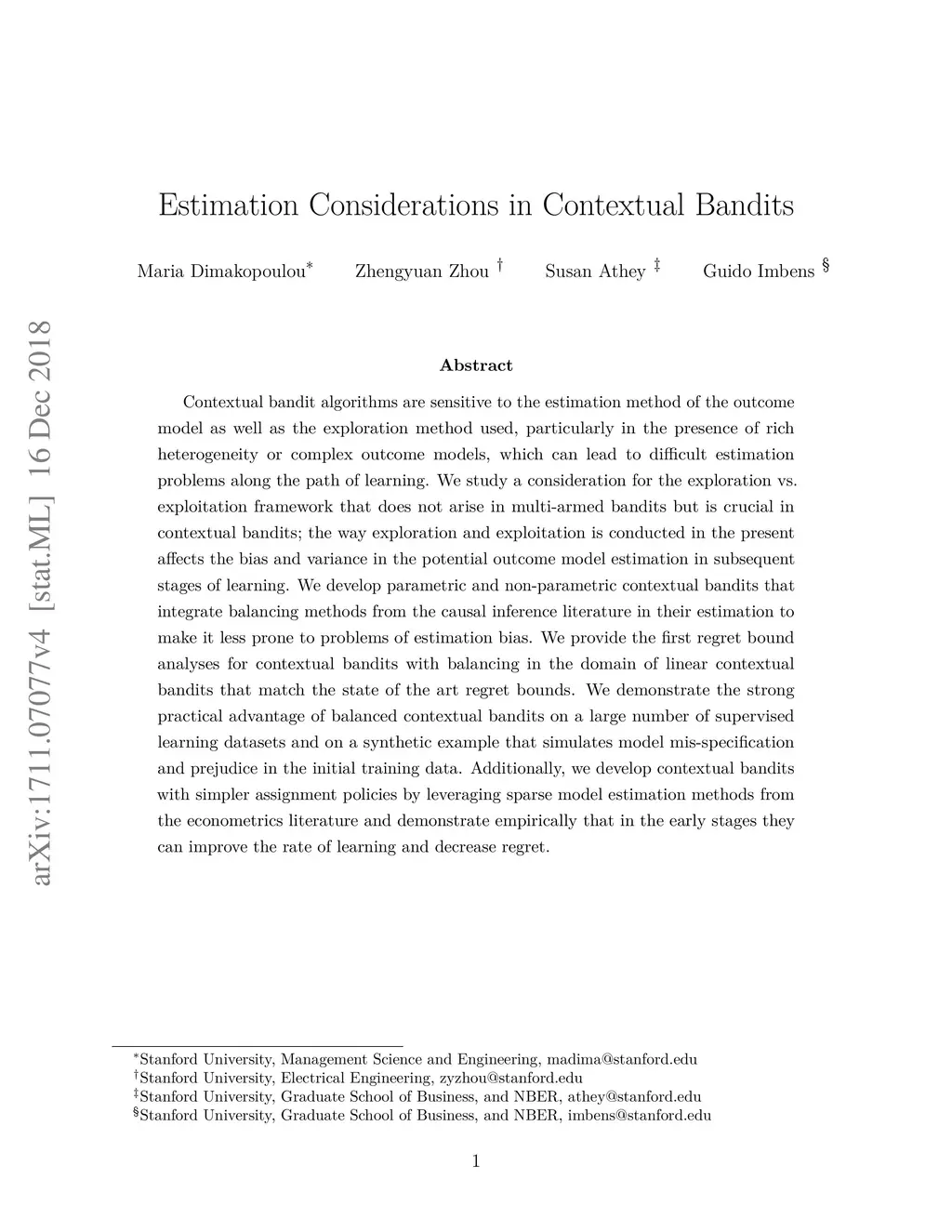 Contextual bandit algorithms are sensitive to the estimation method of the outcome model as well as the exploration method used, particularly in the presence of rich heterogeneity or complex outcome models, which can lead to difficult estimation problems along the path of learning. We study a consideration for the exploration vs. exploitation framework that does not arise in multi-armed bandits but is crucial in contextual bandits; the way exploration and exploitation is conducted in the present affects the bias and variance in the potential outcome model estimation in subsequent stages of learning. We develop parametric and non-parametric contextual bandits that integrate balancing methods from the causal inference literature in their estimation to make it less prone to problems of estimation bias. We provide the first regret bound analyses for contextual bandits with balancing in the domain of linear contextual bandits that match the state of the art regret bounds. We demonstrate the strong practical advantage of balanced contextual bandits on a large number of supervised learning datasets and on a synthetic example that simulates model mis-specification and prejudice in the initial training data. Additionally, we develop contextual bandits with simpler assignment policies by leveraging sparse model estimation methods from the econometrics literature and demonstrate empirically that in the early stages they can improve the rate of learning and decrease regret.
