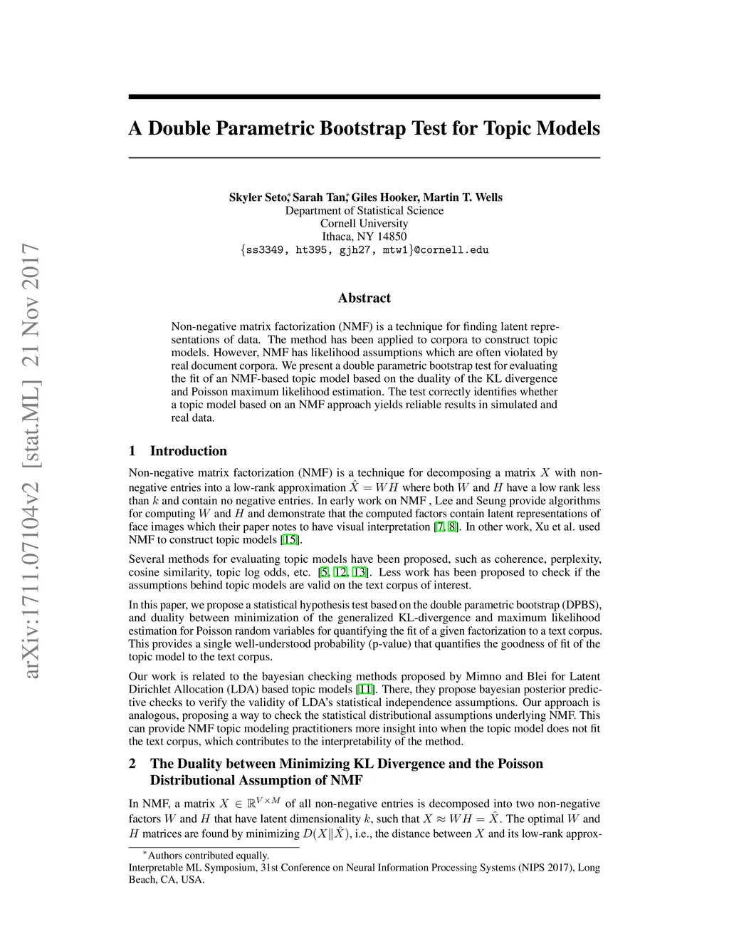Non-negative matrix factorization (NMF) is a technique for finding latent representations of data. The method has been applied to corpora to construct topic models. However, NMF has likelihood assumptions which are often violated by real document corpora. We present a double parametric bootstrap test for evaluating the fit of an NMF-based topic model based on the duality of the KL divergence and Poisson maximum likelihood estimation. The test correctly identifies whether a topic model based on an NMF approach yields reliable results in simulated and real data.