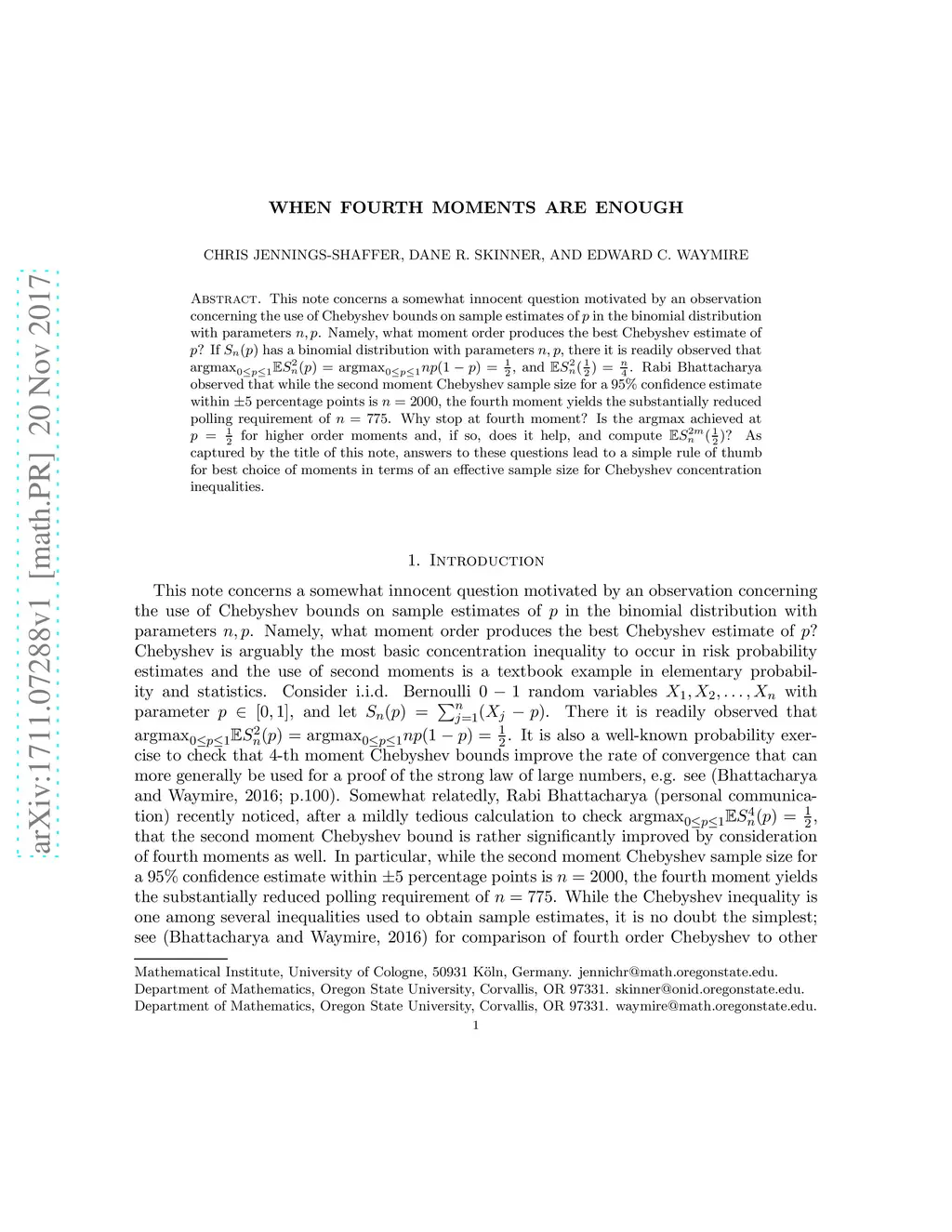 This note concerns a somewhat innocent question motivated by an observation concerning the use of Chebyshev bounds on sample estimates of in the binomial distribution with parameters . Namely, what moment order produces the best Chebyshev estimate of ? If has a binomial distribution with parameters , there it is readily observed that and . Rabi Bhattacharya observed that while the second moment Chebyshev sample size for a confidence estimate within percentage points is , the fourth moment yields the substantially reduced polling requirement of . Why stop at fourth moment? Is the argmax achieved at for higher order moments and, if so, does it help, and compute ? As captured by the title of this note, answers to these questions lead to a simple rule of thumb for best choice of moments in terms of an effective sample size for Chebyshev concentration inequalities.