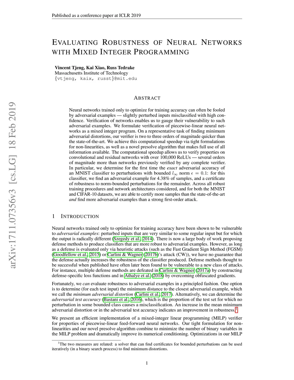 Neural networks have demonstrated considerable success on a wide variety of real-world problems. However, networks trained only to optimize for training accuracy can often be fooled by adversarial examples - slightly perturbed inputs that are misclassified with high confidence. Verification of networks enables us to gauge their vulnerability to such adversarial examples. We formulate verification of piecewise-linear neural networks as a mixed integer program. On a representative task of finding minimum adversarial distortions, our verifier is two to three orders of magnitude quicker than the state-of-the-art. We achieve this computational speedup via tight formulations for non-linearities, as well as a novel presolve algorithm that makes full use of all information available. The computational speedup allows us to verify properties on convolutional networks with an order of magnitude more ReLUs than networks previously verified by any complete verifier. In particular, we determine for the first time the exact adversarial accuracy of an MNIST classifier to perturbations with bounded norm : for this classifier, we find an adversarial example for 4.38% of samples, and a certificate of robustness (to perturbations with bounded norm) for the remainder. Across all robust training procedures and network architectures considered, we are able to certify more samples than the state-of-the-art and find more adversarial examples than a strong first-order attack.