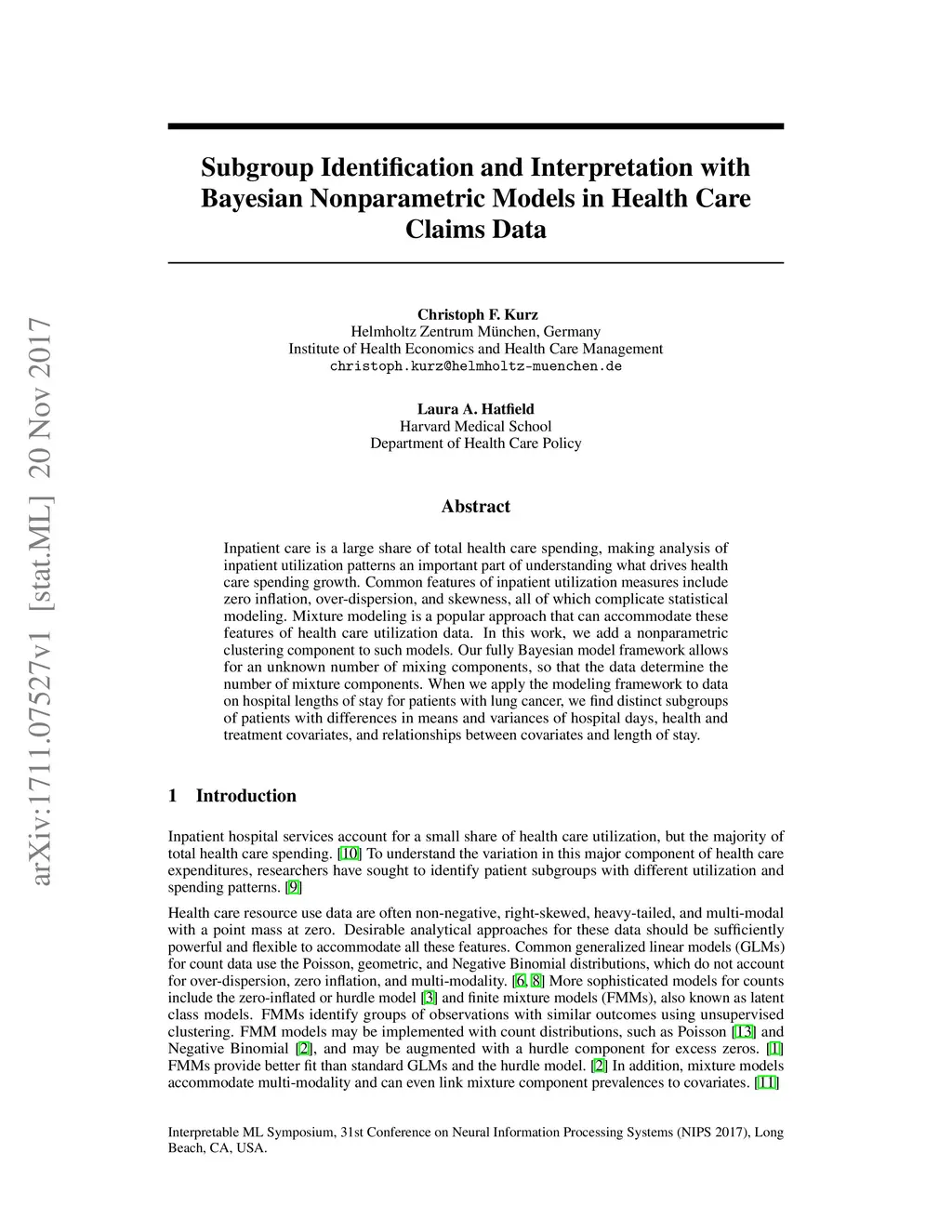 Inpatient care is a large share of total health care spending, making analysis of inpatient utilization patterns an important part of understanding what drives health care spending growth. Common features of inpatient utilization measures include zero inflation, over-dispersion, and skewness, all of which complicate statistical modeling. Mixture modeling is a popular approach that can accommodate these features of health care utilization data. In this work, we add a nonparametric clustering component to such models. Our fully Bayesian model framework allows for an unknown number of mixing components, so that the data determine the number of mixture components. When we apply the modeling framework to data on hospital lengths of stay for patients with lung cancer, we find distinct subgroups of patients with differences in means and variances of hospital days, health and treatment covariates, and relationships between covariates and length of stay.