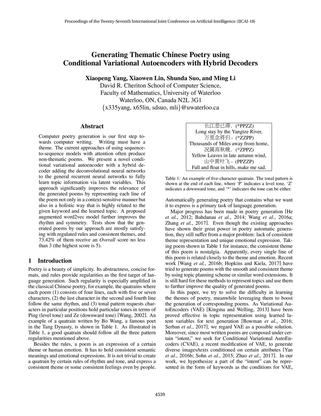 Computer poetry generation is our first step towards computer writing. Writing must have a theme. The current approaches of using sequence-to-sequence models with attention often produce non-thematic poems. We present a novel conditional variational autoencoder with a hybrid decoder adding the deconvolutional neural networks to the general recurrent neural networks to fully learn topic information via latent variables. This approach significantly improves the relevance of the generated poems by representing each line of the poem not only in a context-sensitive manner but also in a holistic way that is highly related to the given keyword and the learned topic. A proposed augmented word2vec model further improves the rhythm and symmetry. Tests show that the generated poems by our approach are mostly satisfying with regulated rules and consistent themes, and 73.42% of them receive an Overall score no less than 3 (the highest score is 5).