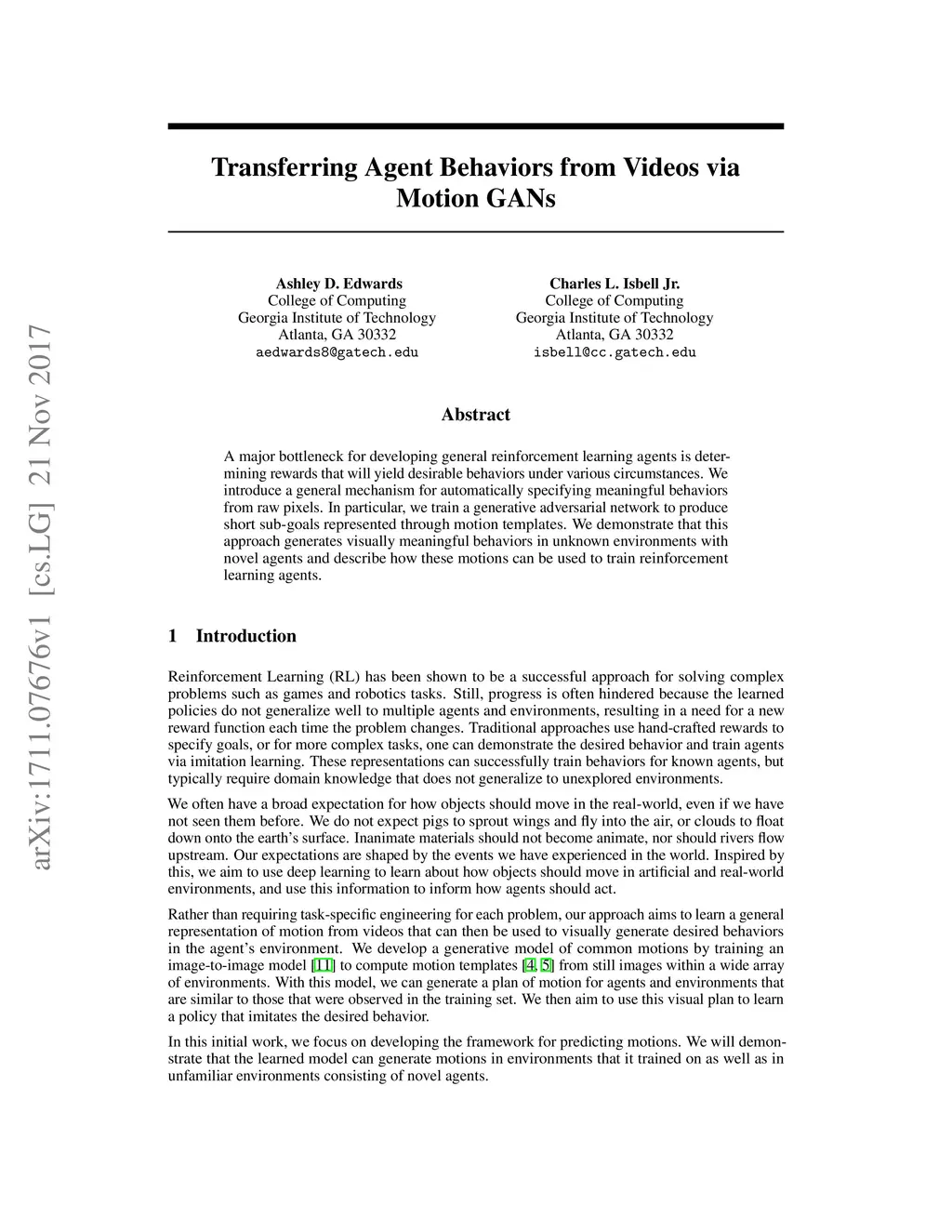 A major bottleneck for developing general reinforcement learning agents is determining rewards that will yield desirable behaviors under various circumstances. We introduce a general mechanism for automatically specifying meaningful behaviors from raw pixels. In particular, we train a generative adversarial network to produce short sub-goals represented through motion templates. We demonstrate that this approach generates visually meaningful behaviors in unknown environments with novel agents and describe how these motions can be used to train reinforcement learning agents.